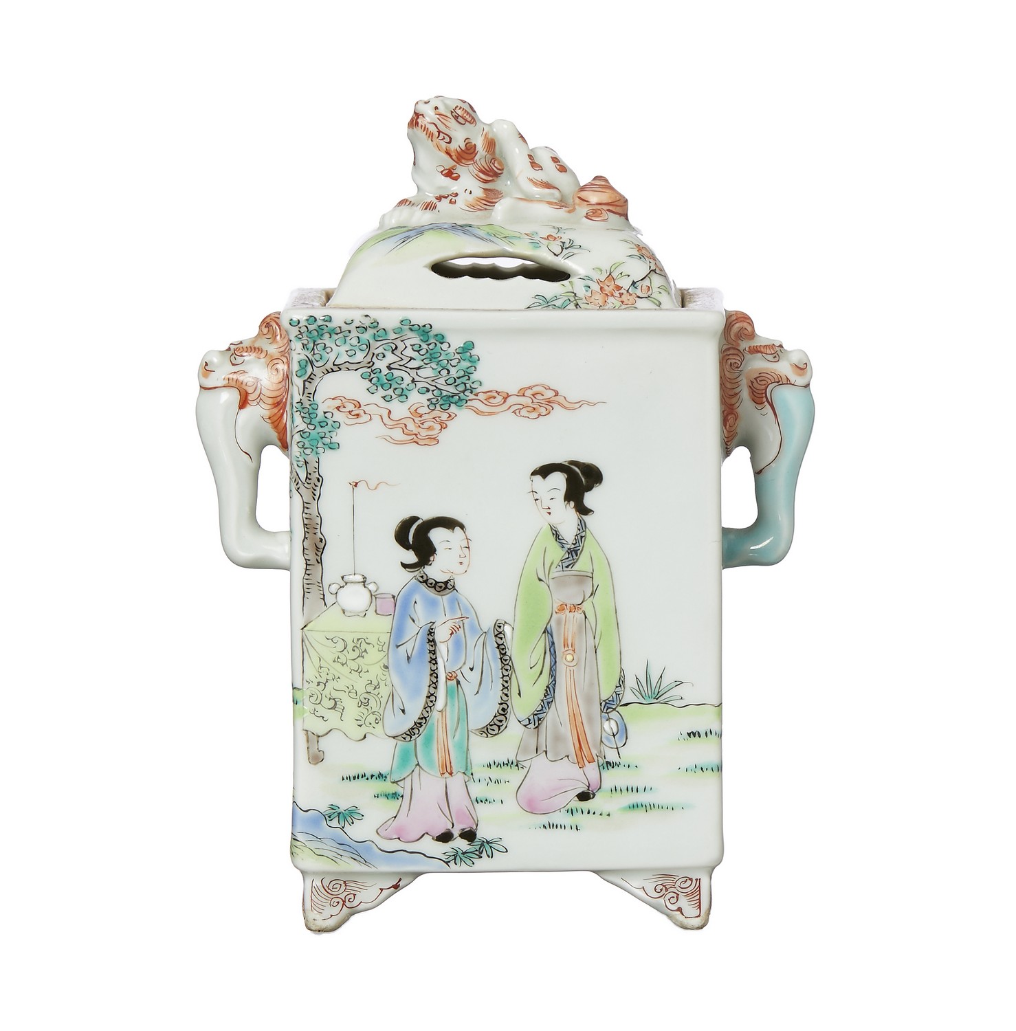 Rectangular with a pierced cover surmounted by a Shi Shi dog, painted with courtly ladies in a garden.