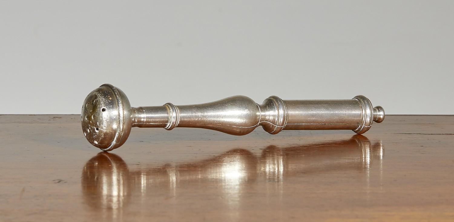 The aspersorium in very good condition with age expected patina to the gilt finish, the lead liner intact. The aspergillum with separation along the joins and dinting to the base.
