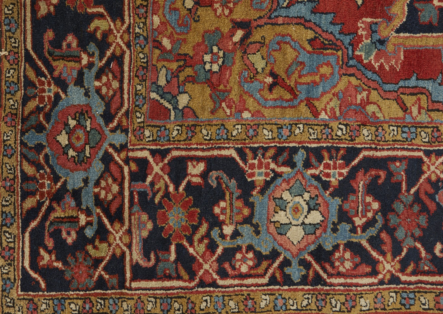 Each with a navy medallion on red ground within mustard spandrels and nave borders, with an all over design of scrolls and flowerheads (2).