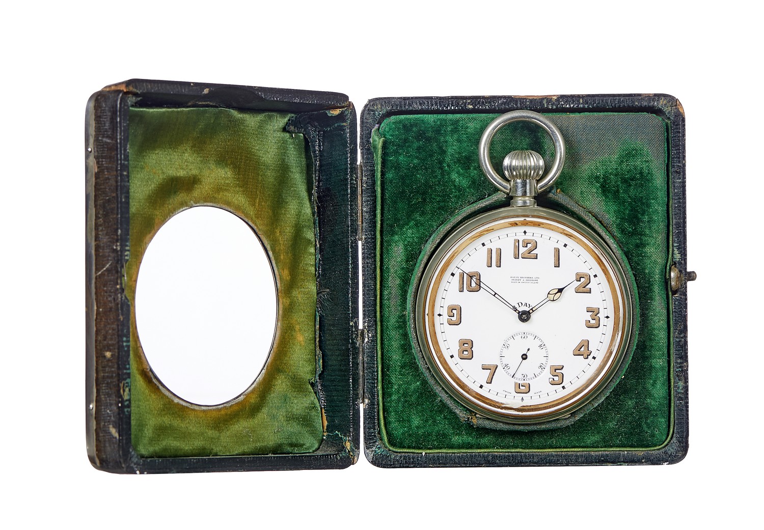 The case with maker's mark of Syner and Beddoes, Birmingham 1916, retailed by Hardy Brothers, with engine engraved decoration, the Swiss watch with Arabic numerals, seconds dial and 8 day movement, retailed by Hardy Brothers Sydney and Brisbane.