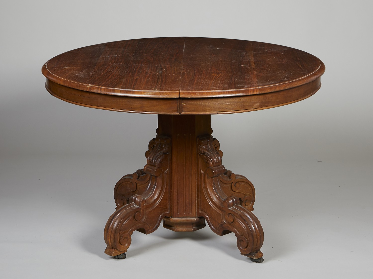 The circular moulded top extending to take two extra leaves on an octagonal pedestal with scroll carved supports with castors.
