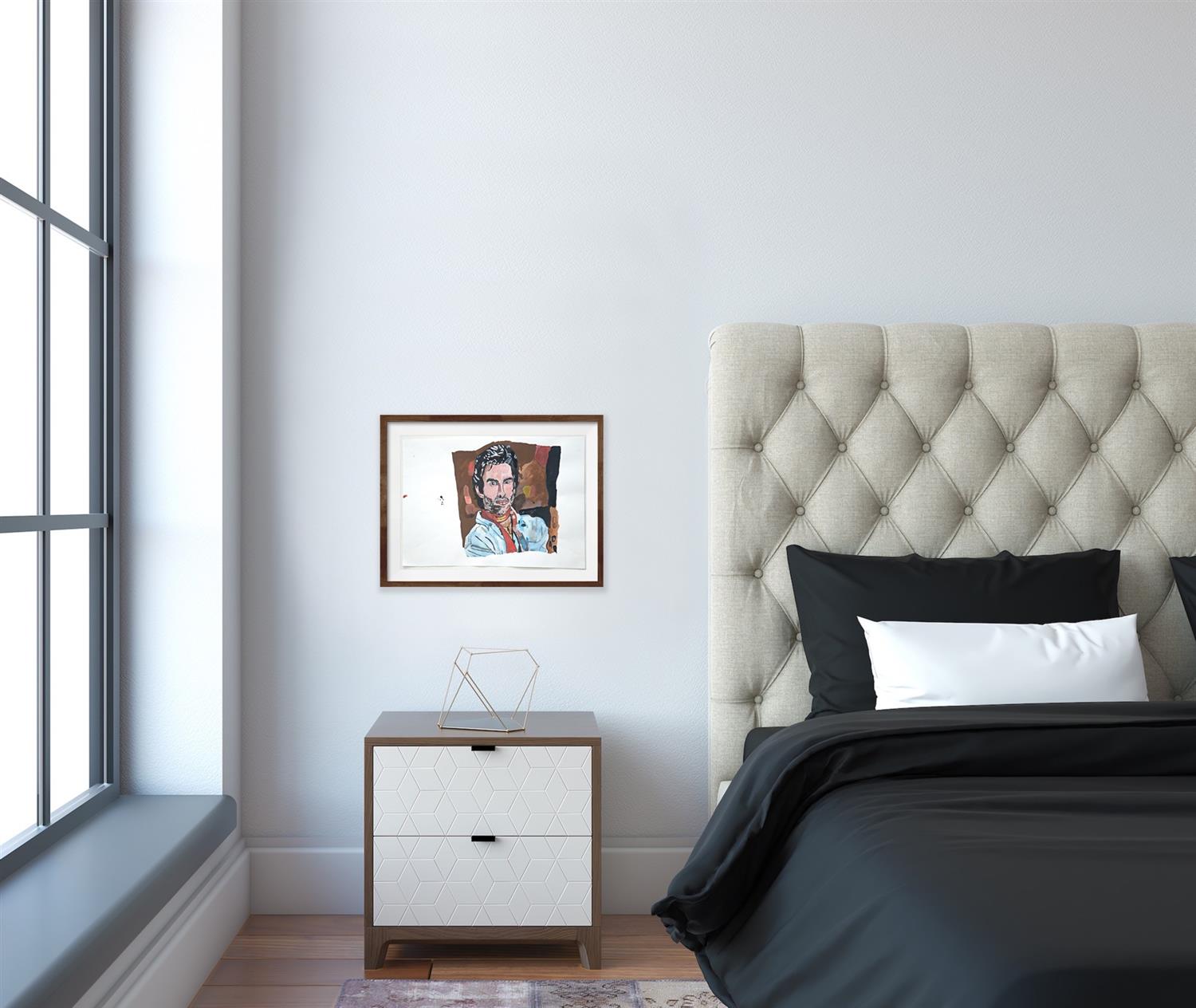 Bobby Kyriakopoulos' practice focuses primarily on painting and drawing, with a meticulous and deliberate application of watercolour and gouache. His depiction of stills from film and tv productions are particularly magnetic, the highly gestural work seemingly capturing the subject matter in direct gaze with the viewer. Ridge, featuring the fictional character Ridge Forester from Days of Our Lives, pays homage, arguably ironically, to the actor, showcasing his characteristic interplay of positive and negative space. Kyriakopoulos has worked at Arts Project Australia studio since 2011. His work is held in the National Gallery of Victoria collection.