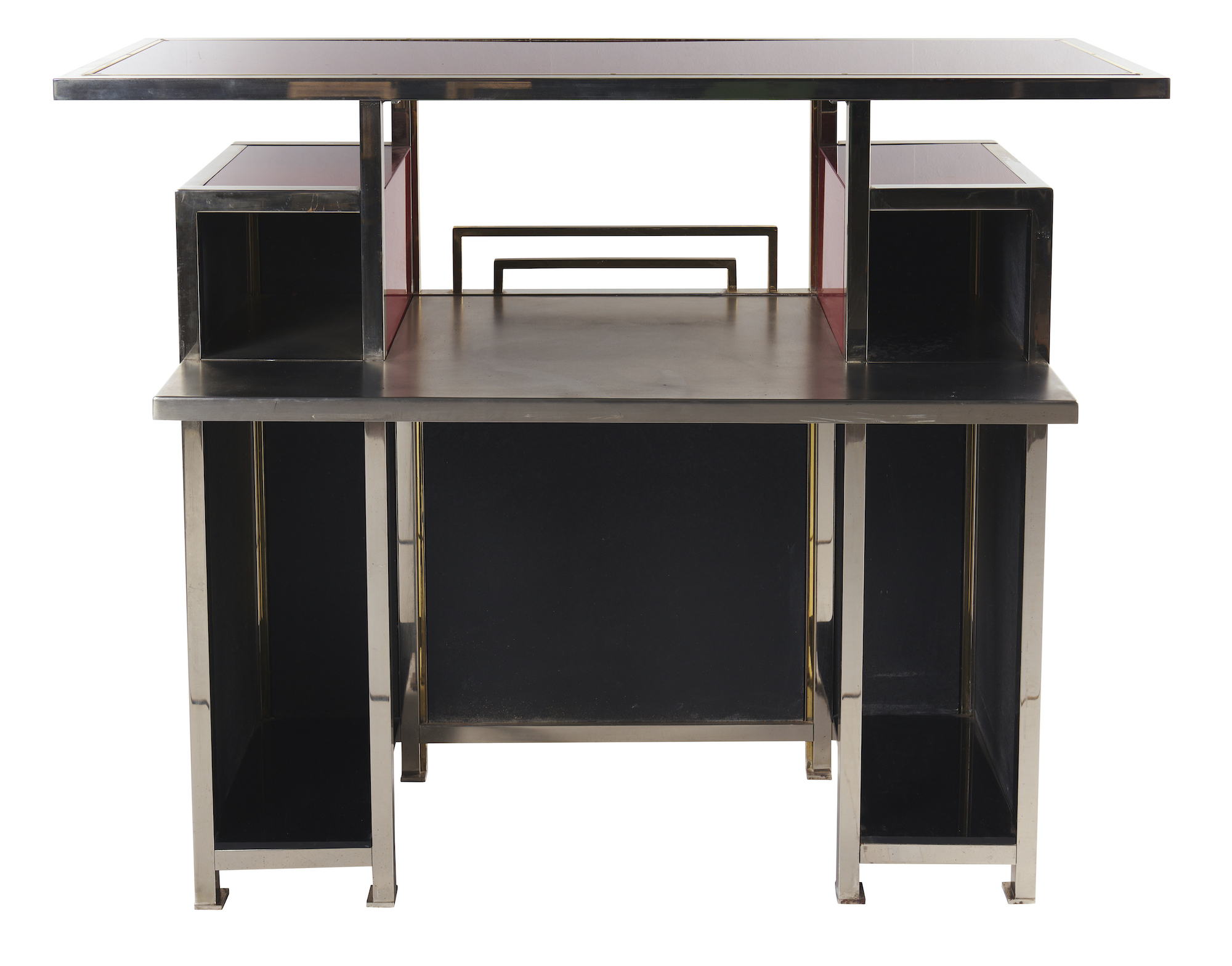 Red glass, chrome and brass. Bar stools covered in red vinyl uphostery