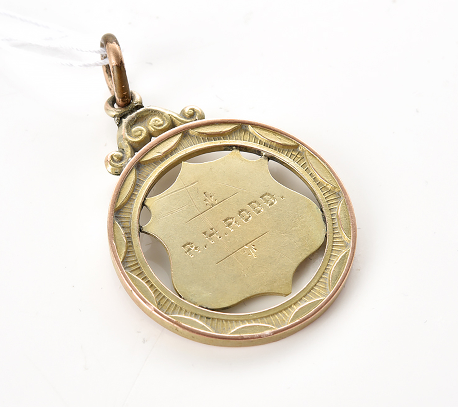 A VINTAGE FOOTBALL CLUB MEDALLION, INSCRIBED D.F.C PREMIERES 1919, IN 9CT GOLD, 6.8GMS, INSCRIBED ON THE REVERSE R.H.RODD, LENGTH 35MM