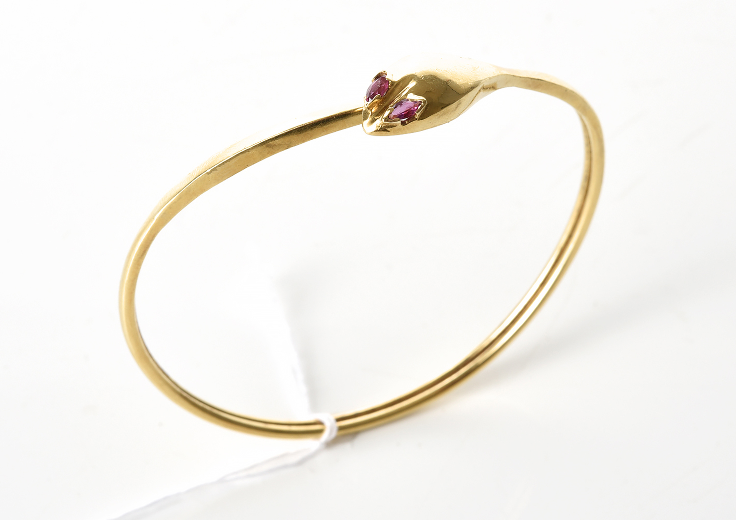 A GOLD AND RUBY SERPENT BANGLE, IN 18CT GOLD, INNER DIAMETER 60MM, 11.89 GMS