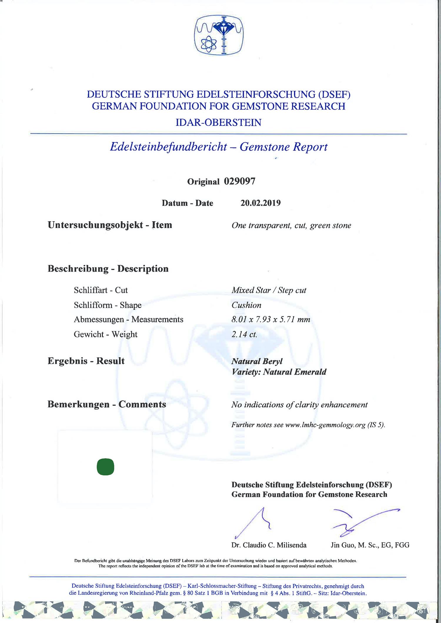 Accompanied by a SSEF report numbered 105313, dated 6 March 2019, stating that the 2.14 carat emerald is natural, with no indications of clarity enhancement, of Australian origin.