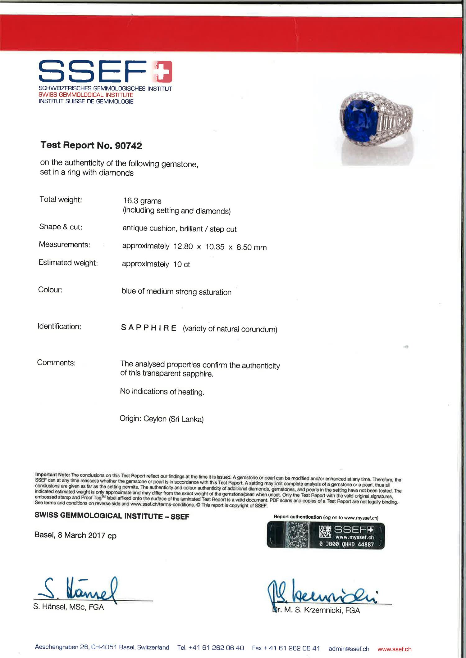 Accompanied by SSEF report numbered 90742, dated 8 March 2017, stating that the sapphire is approximately 10 carats, of Ceylon (Sri Lankan) origin, with no evidence of heat treatment.