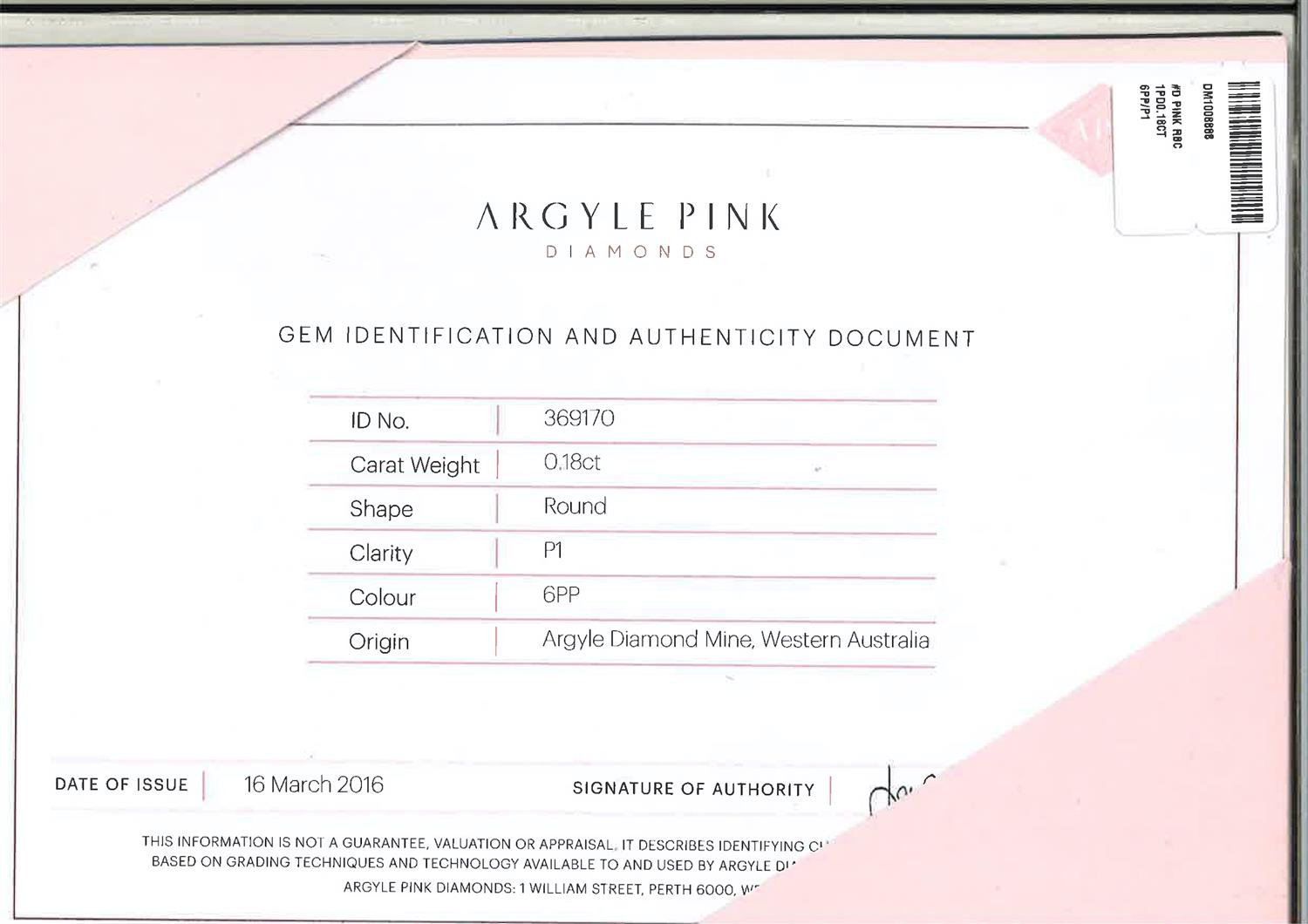 an Argyle report numbered 369170, dated 16 March 2016, stating that the 0.18 carat diamond is 6PP colour and P1 clarity.