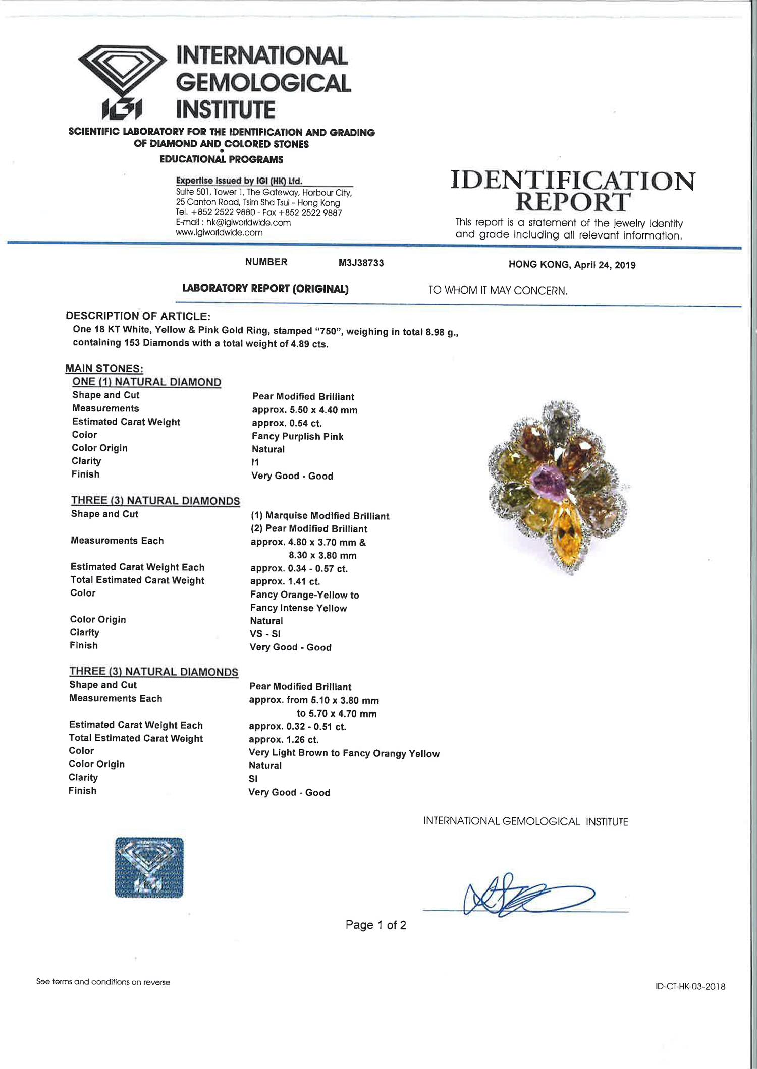 Accompanied by an IGI report numbered M3J38733, dated 24 March 2019, stating that the 0.54 carat natural diamond is Fancy Purplish Pink colour, I1 clarity; the three natural diamonds ranging 0.34-0.57ct each are Fancy Orange-Yellow to Fancy Intense Yellow colour and VS-SI clarity; the three natural diamonds ranging 0.32-0.51ct each are SI clarity.