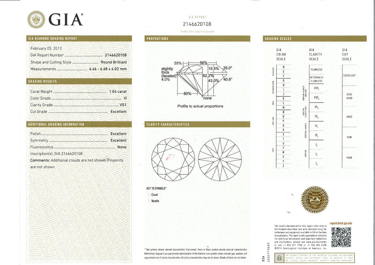 Accompanied by a GIA report numbered 2146620108, dated 5 February 2013, stating that the 1.04 carat diamond is H colour, VS1 clarity, laser inscribed.