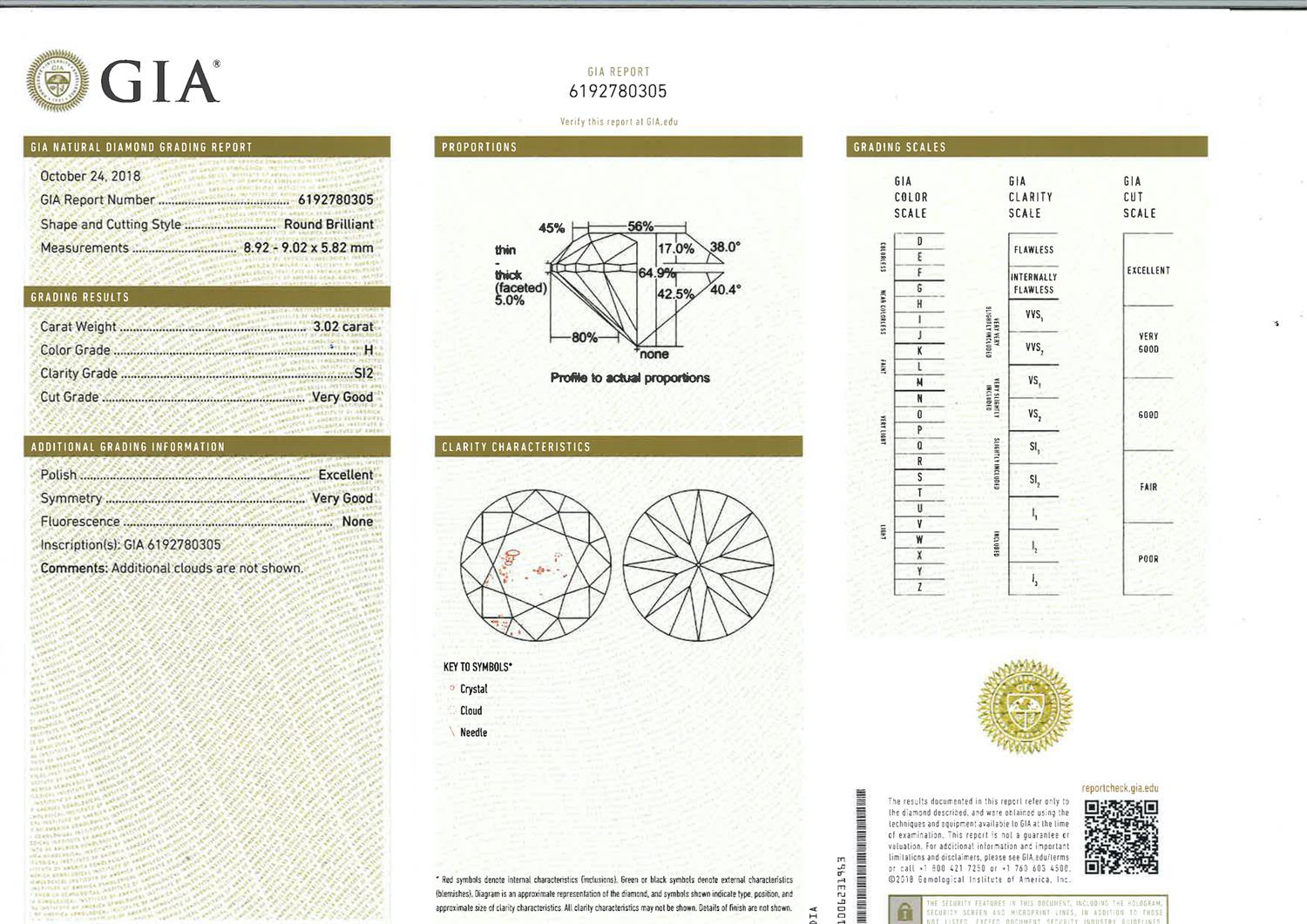 Accompanied by a GIA report numbered 6192780305, dated 24 October 2018, stating that the 3.02 carat diamond is H colour, SI2 clarity, laser inscribed.