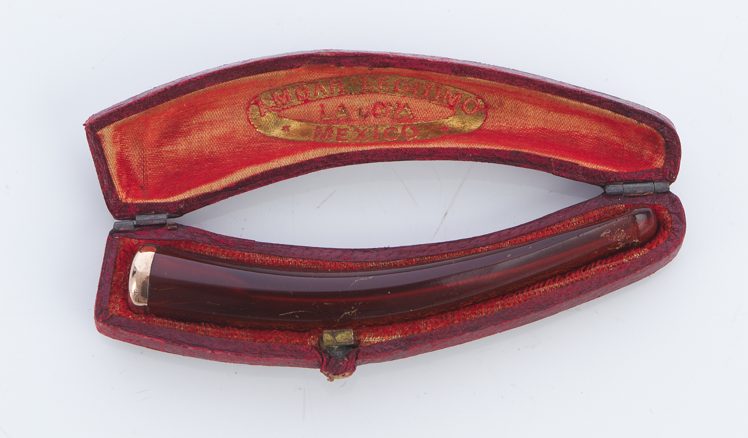 TWO ANTIQUE CIGARETTE HOLDERS IN AMBER, ONE SET WITH A GOLD RIM AND THE OTHER ONE WITH STERLING SILVER DETAILS, HALLMARKED CHESTER 1907 (A/F), BOXED, LENGTH 9CM AND 6.5CM
