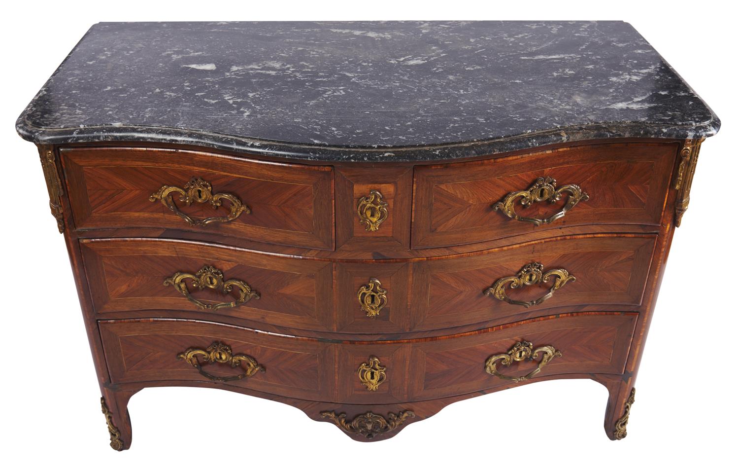 Serpentine fronted with a marble plate top, kingwood parquerty and string inlay overall, the pair of drawers above two larger drawers, all applied with gilded brass acanthus scroll handles and escutcheons, ormolu to the corners, apron and feet
