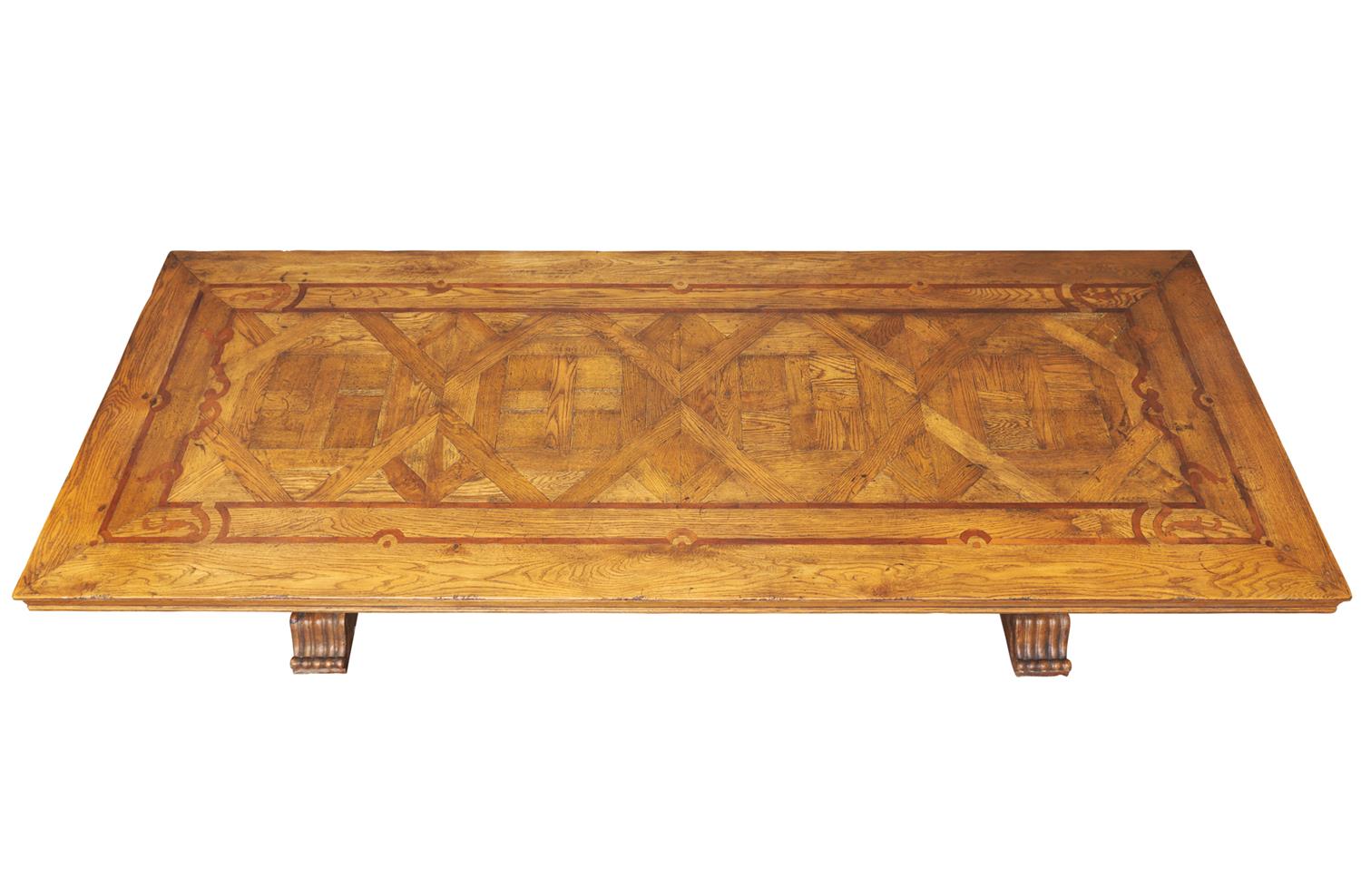 The parquetry top with marquetry decoration, sitting upon two solid oak pedestals each applied with gilded moulded plaques and ebonsied consoles, united with a stretcher centered with applied gilded masks