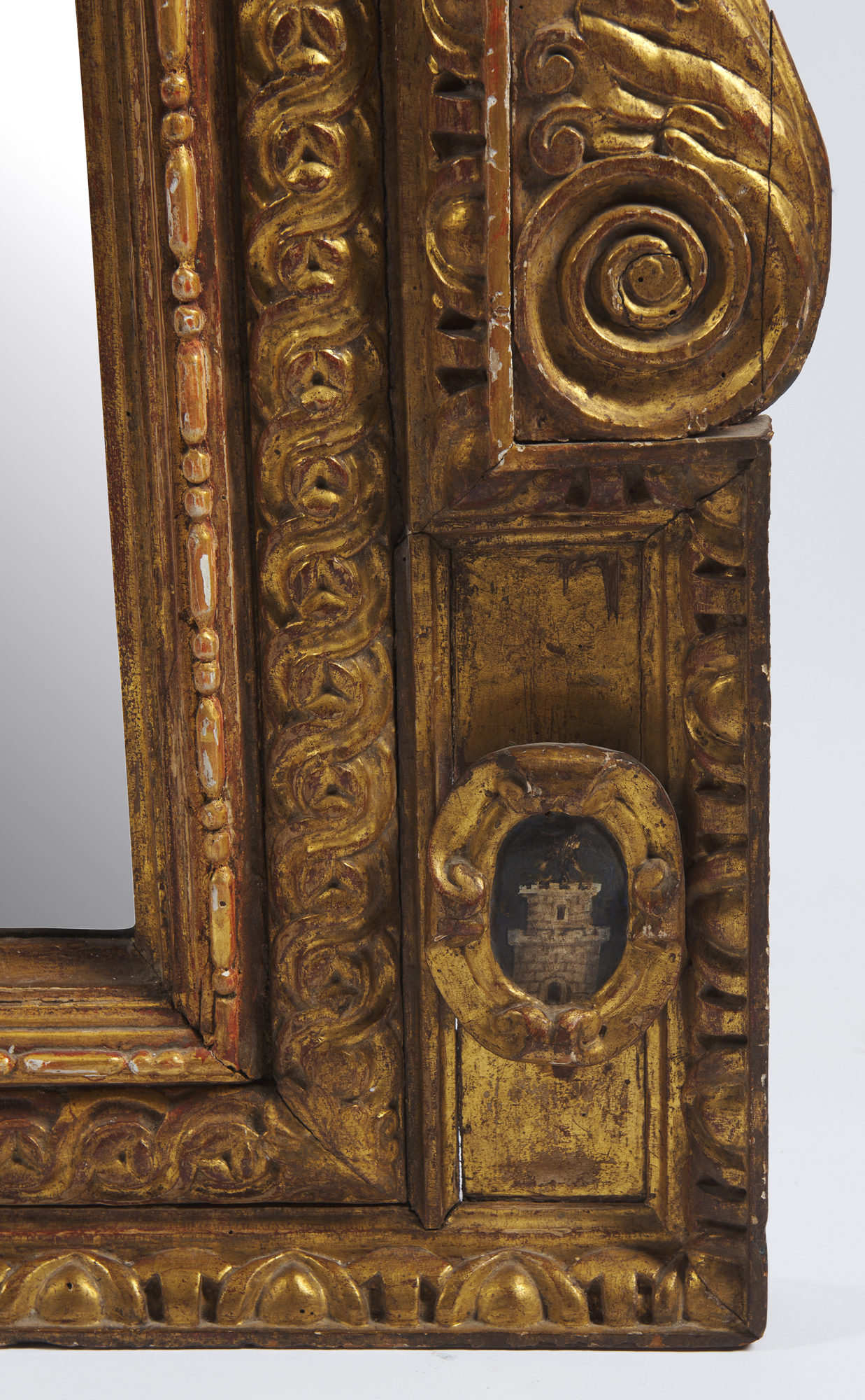 small losses and breaks to giltwood frame overall consistent with age and use. deterioration to mirror plate overall.
