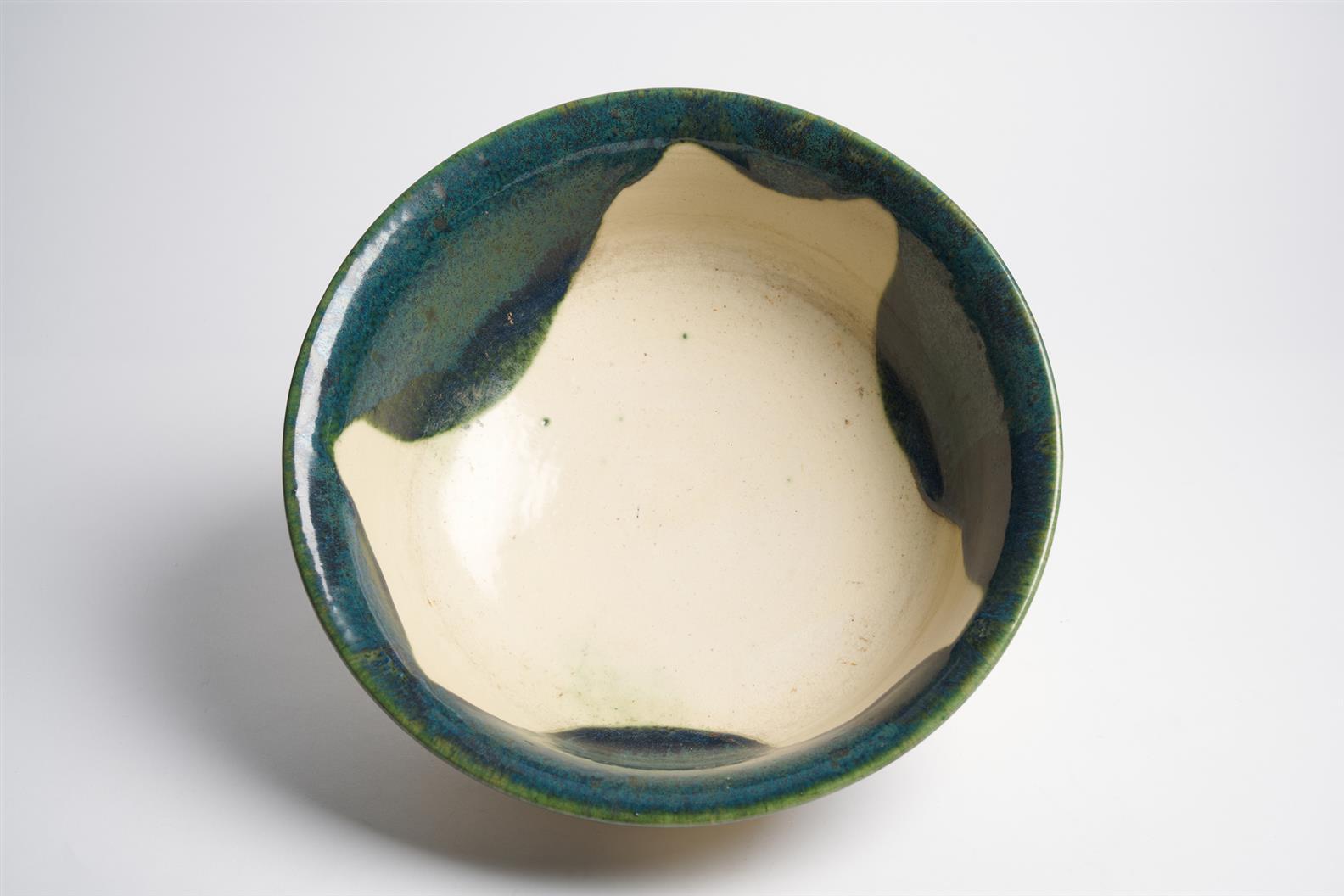 The stoneware bowl covered in a creamy yellowish tinged crackle gaze, decorated with thickly applied greenish-blue crystaline glaze to the rim dripping down both the inner and outer sides in large attractve drips. Marked to the side of the footrim with an impressed pentagonal mark 'Tosa'.