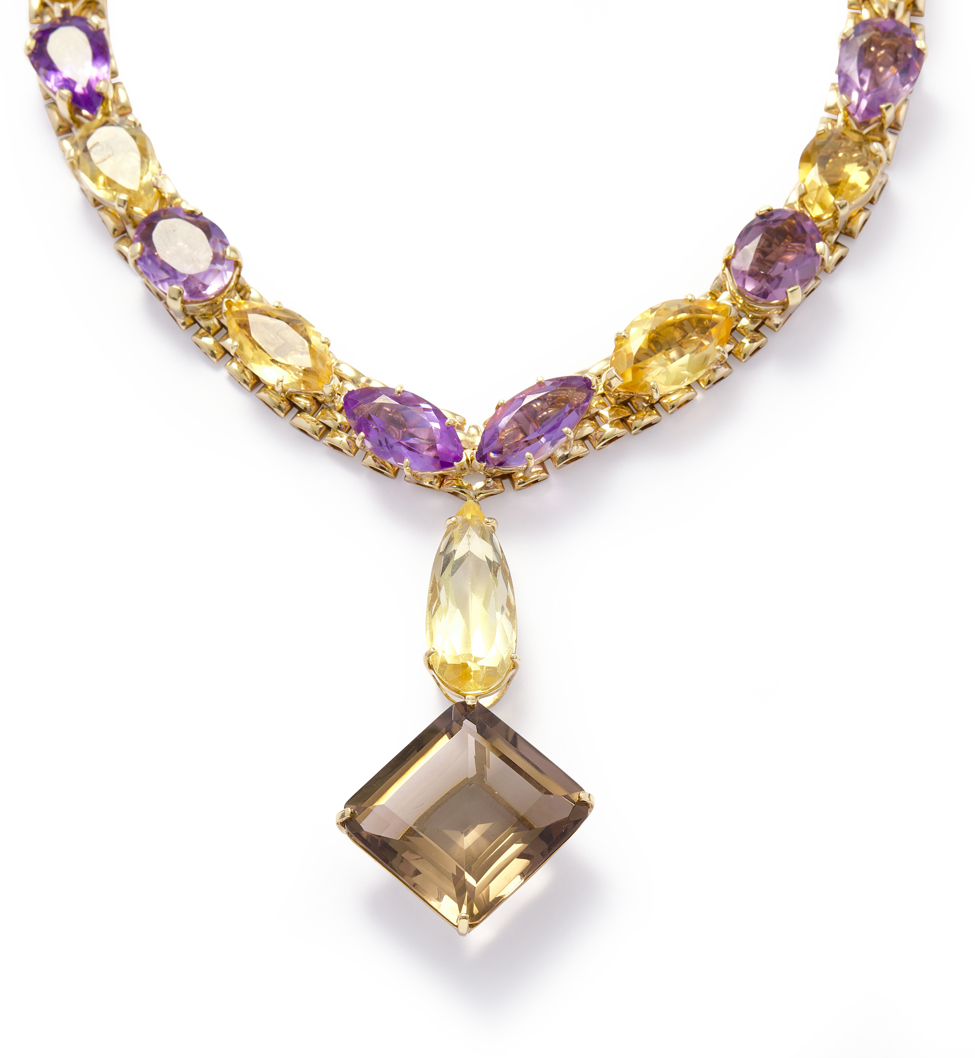 Composed of a gate link chain claw-set to the front with a line of variously-cut amethyst between similarly cut citrine supporting an emerald-cut smoky quartz, between a pear-shaped citrine connector, circumference approximately 390mm.