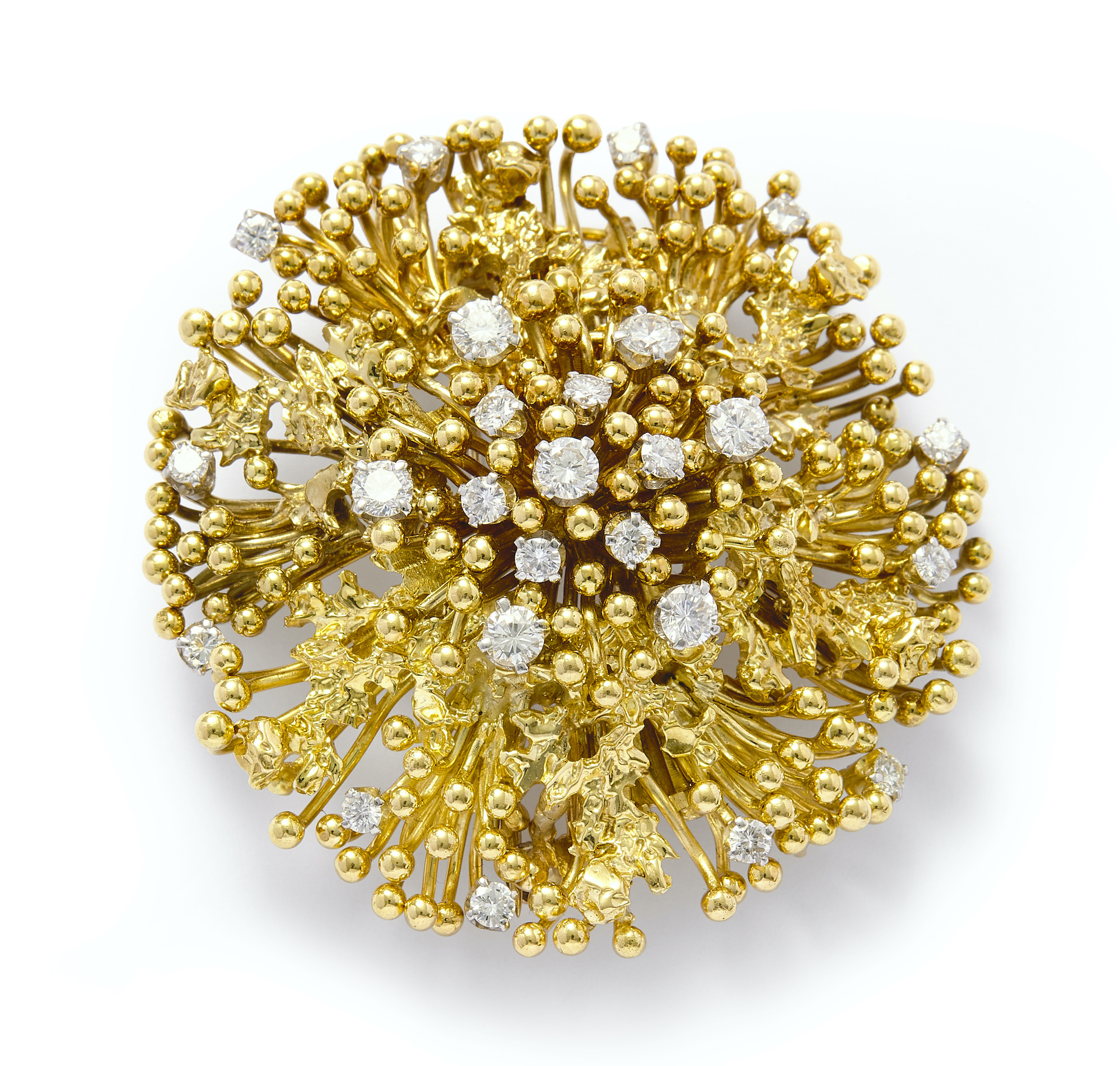 Designed as a textured openwork floral spray decorated at intervals with claw-set brilliant-cut diamonds, diameter approximately 45mm, signed Webb for David Webb, floral stem detachable.