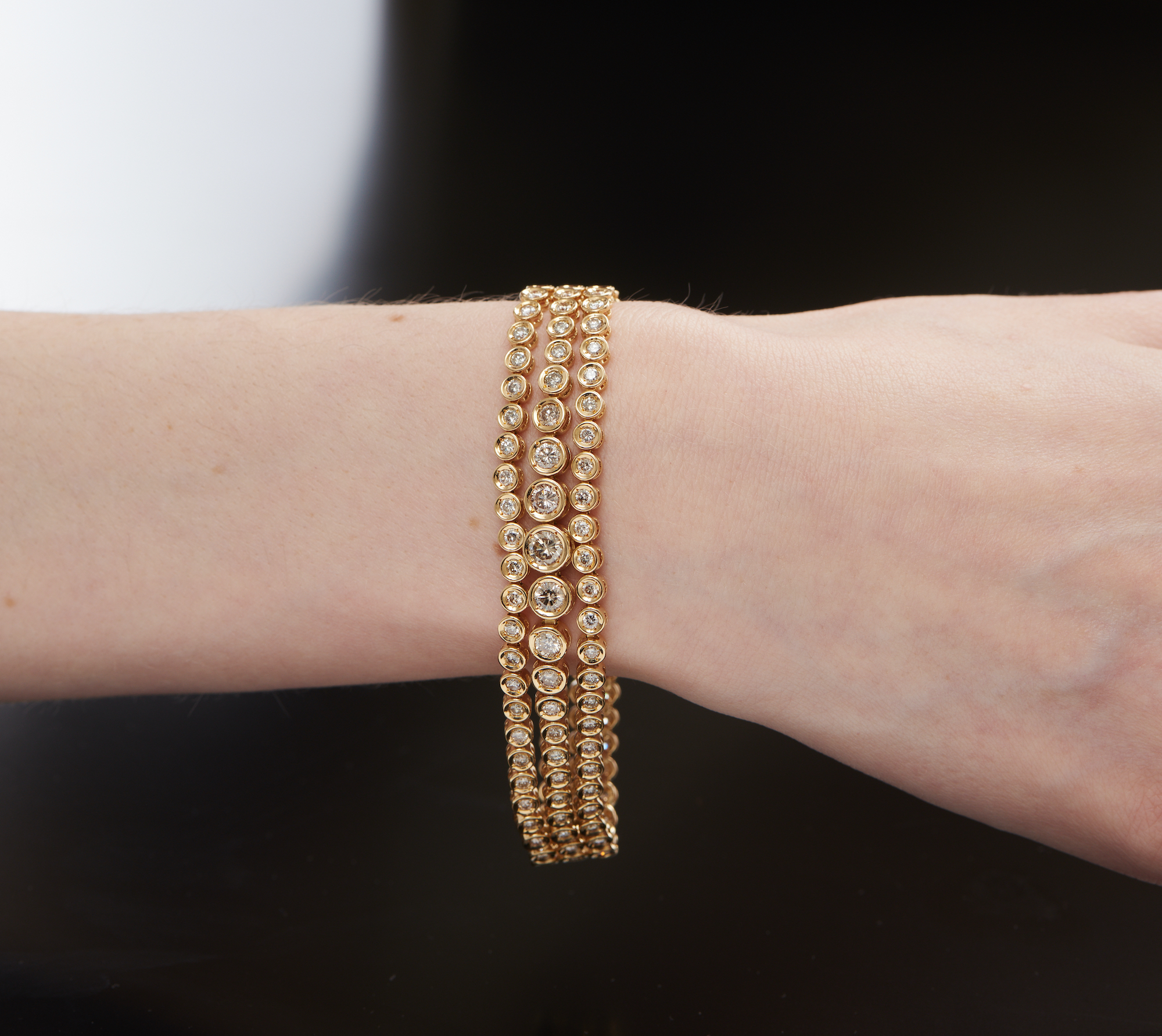 Comprising three lines of collet-set graduated brilliant-cut diamonds, the diamonds together weighing approximately 5.00 carats, length approximately 185mm.