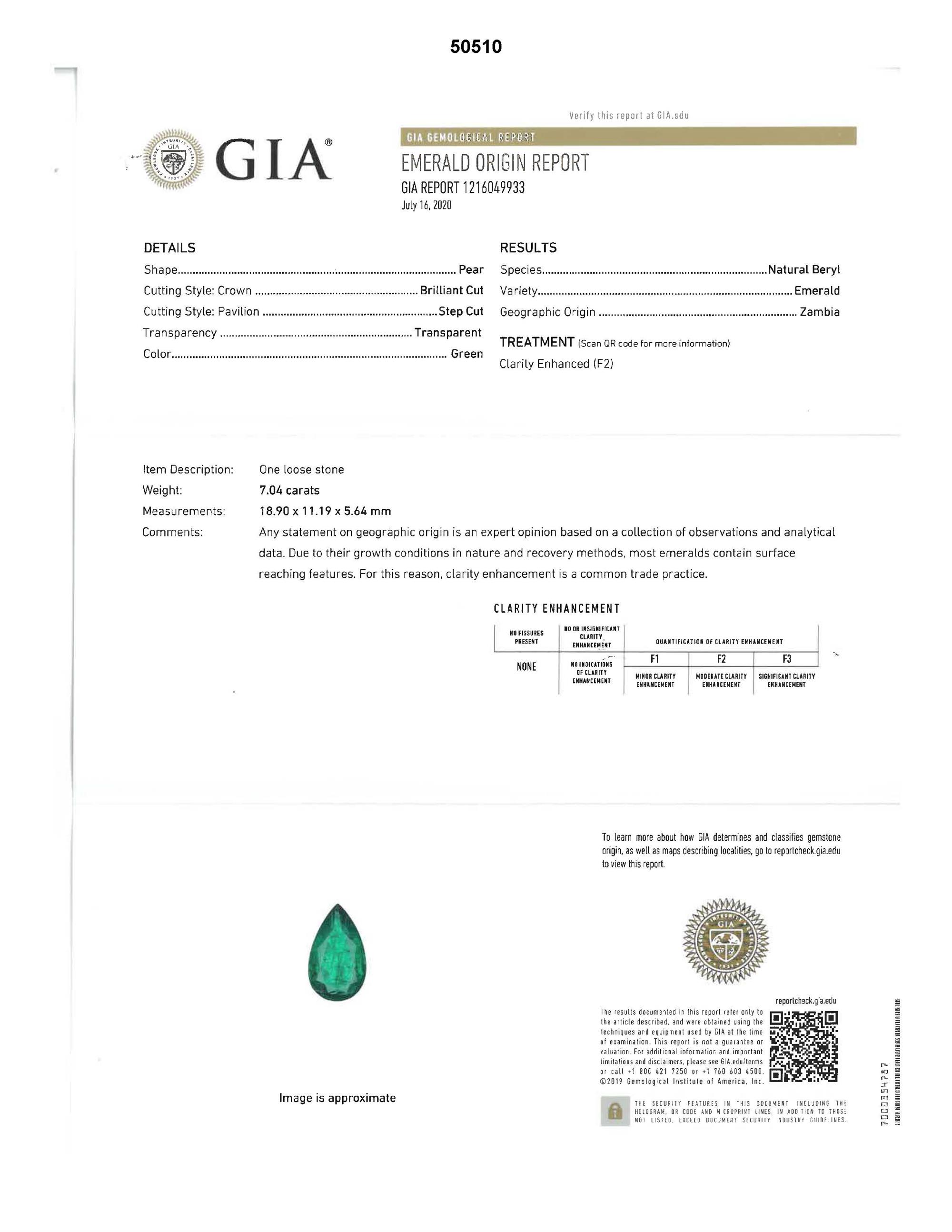 a GIA report numbered 1216049933, dated 16 July 2020, stating that the 7.04 carat emerald is natural, and of Zambian origin;