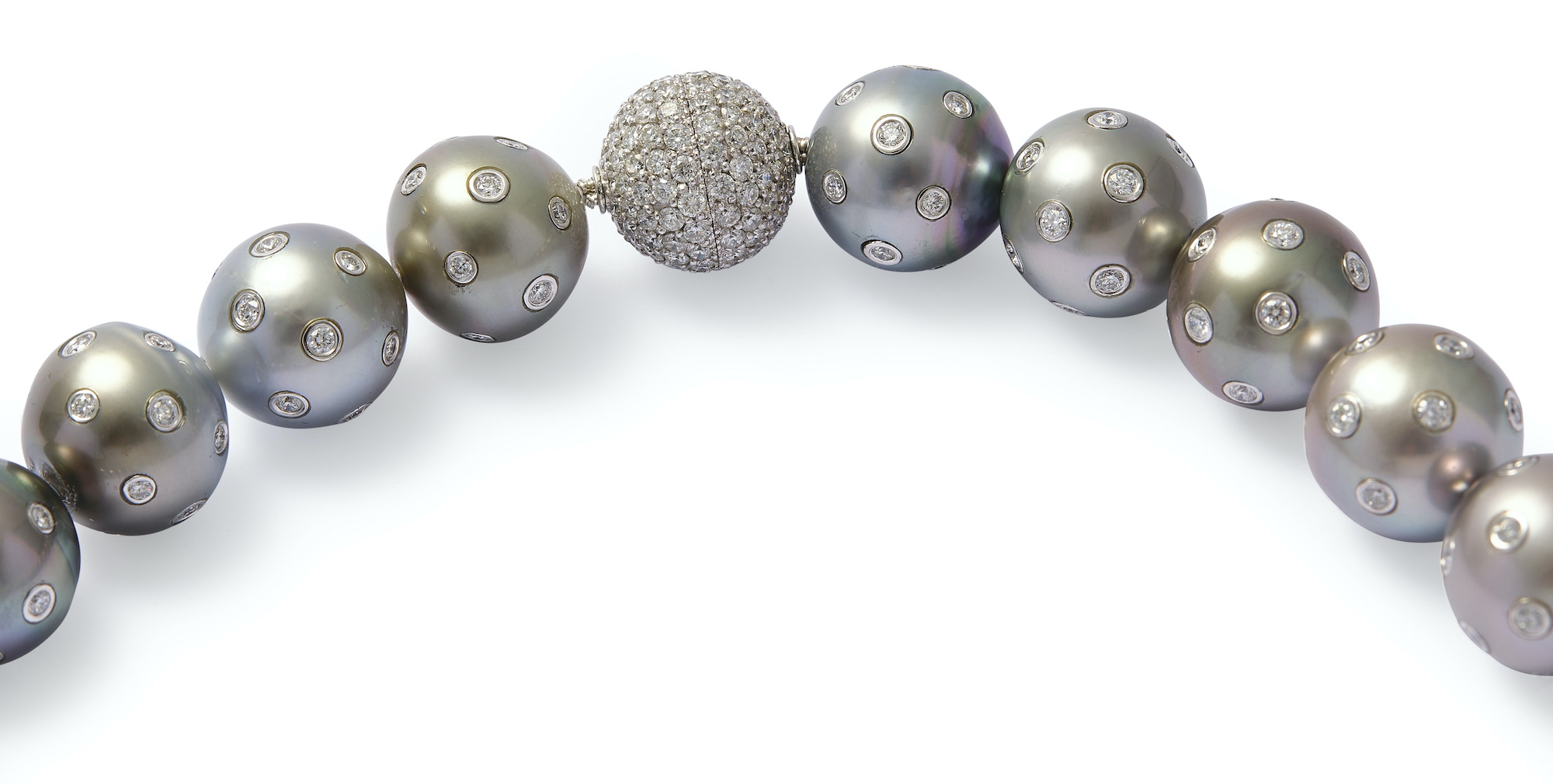 Composed of 54 cultured pearls of fine platinum hue, graduating from approximately 15.00mm-17.82mm embellished with 900 brilliant-cut diamonds together weighing approximately 28.16 carats, completed by an 18ct white gold ball clasp pavé-set with brilliant-cut diamonds together weighing approximately 3.99 carats, circumference approximately 920mm.