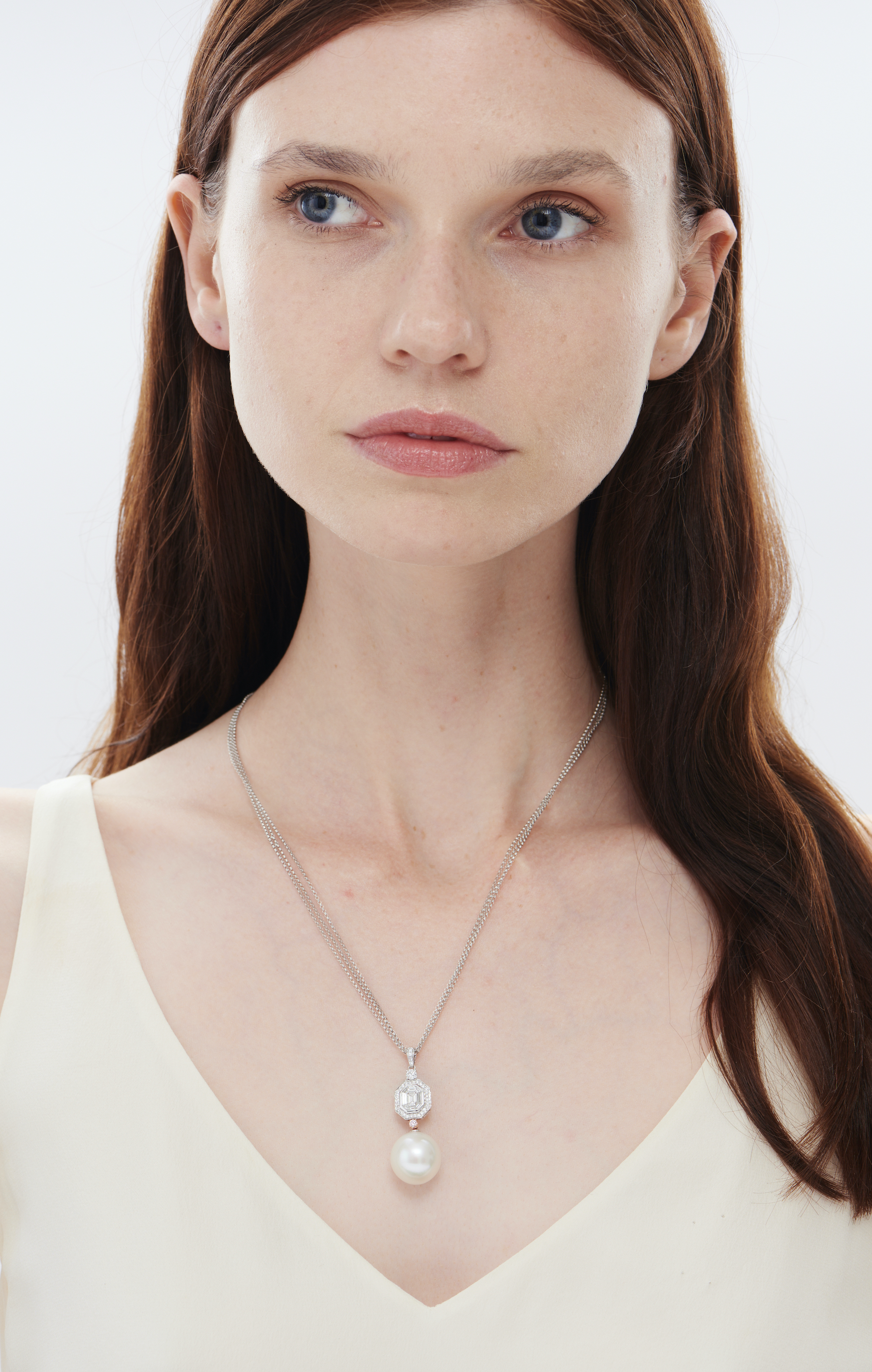 Terminating on a cultured pearl swing drop measuring approximately 15.00mm, supported from an octagonal surmount decorated with baguette and brilliant-cut diamonds between an Argyle natural fancy intense pink diamond connector, suspended from a double trace link necklace, pendant length approximately 40mm, chain circumference approximately 440mm.