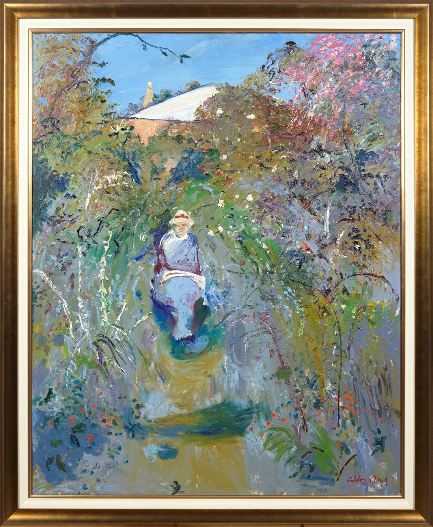 Many of Arthur's paintings of Bundanon are powerful landscapes, encompassing the harsh beauty of Australian nature. Bundanon Garden and Studio 1993 demonstrates a more delicate approach, reminiscent of the Heidelberg artists such as Roberts or Streeton in its sentimentality. This particular painting is Arthur's touching tribute to Yvonne - his wife and home. Yvonne is at one with the garden, enveloped by its arching branches and floral tendrils. She sits joyfully amidst the blooming garden, their happy home framed behind her. In contrast to Arthur's sharp depictions of the rocky Shoalhaven with deep browns and reds, Bundanon Garden and Studio 1993 is an intricate pattern of pinks, purples, blues and greens. One can imagine Arthur showing it to Yvonne upon completion, eager to hear her praise and acceptance of his loving portrait.