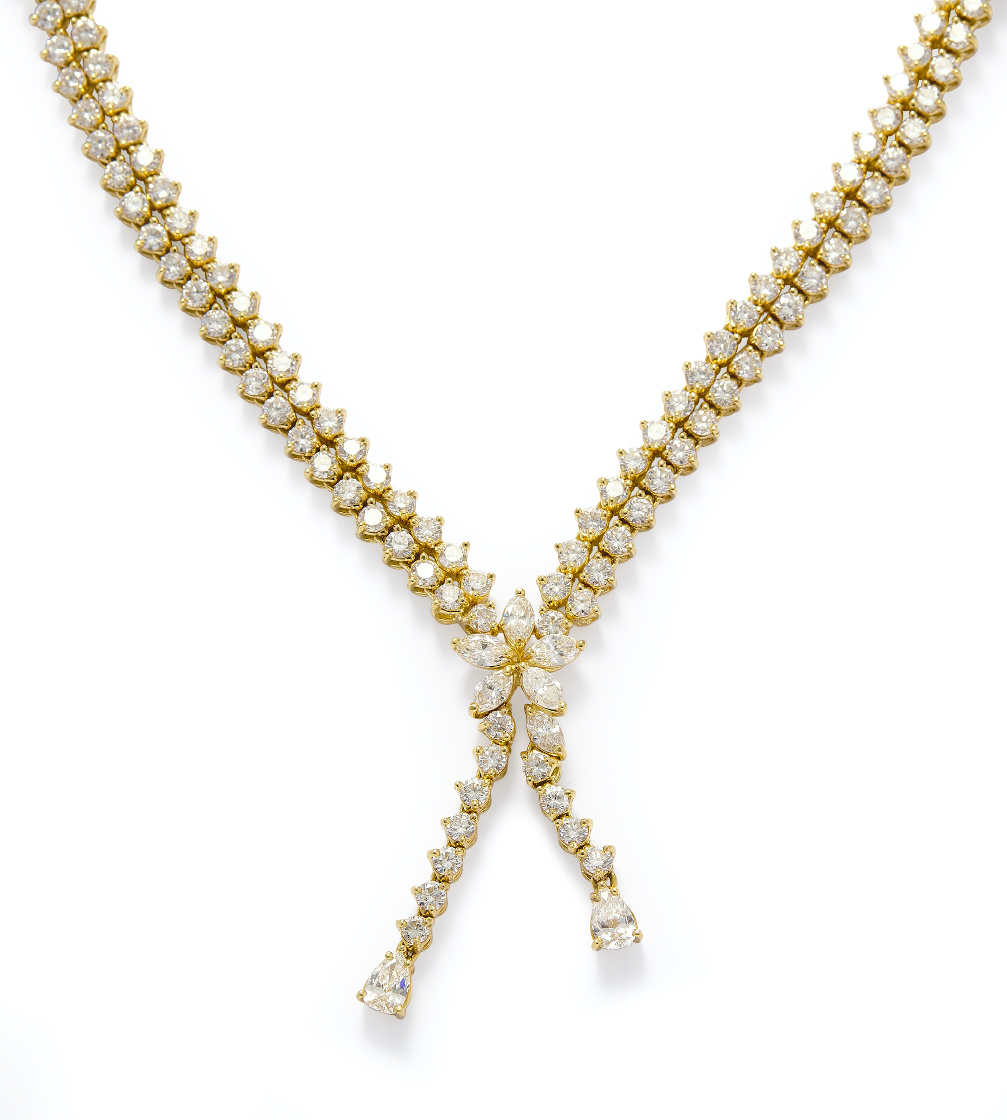 Terminating in a tassel of claw-set pear-shaped diamonds supported from a twin line of brilliant-cut diamonds surmounted by a flower head decorated with marquise-shaped diamonds, flanked by a necklace comprising of a double row of brilliant-cut diamonds together weighing approximately 9.10 carats, completed by rope chain, circumference approximately 380mm.
