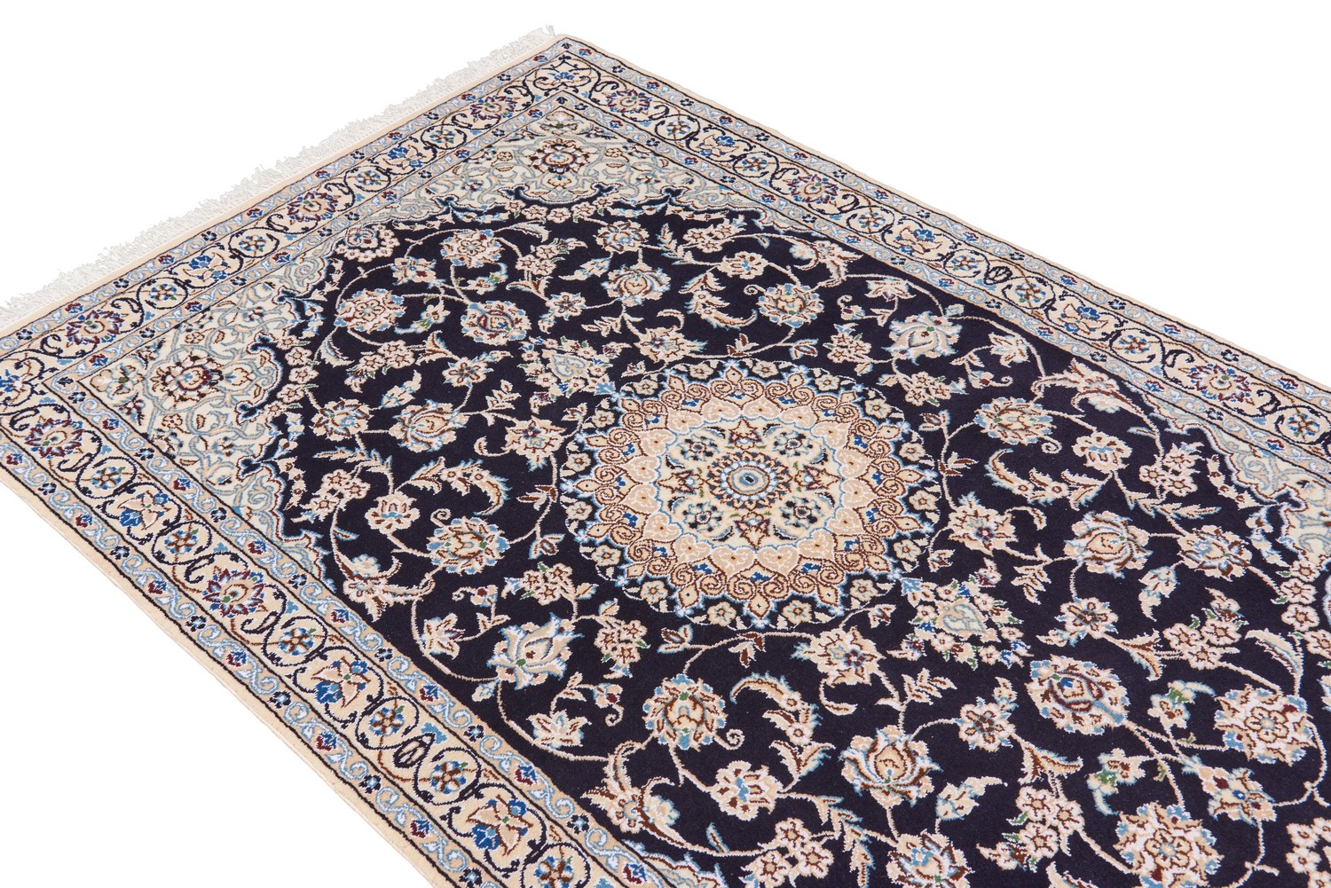 A FINE PERSIAN NAIEN CARPET. Silk inter-knots within a wool pile. Finely hand-knotted weave of approximately 360,000 knots per square meter. Classic Naien design of sunburst circular medallion & quartered corner medallions in a field of palmettes, blossoming floral sprays & tendrils. Border of palmettes & rosettes. Ex-gallery inventory. In pristine condition. Certificate of authenticity included. SIZE: 185X118 ORIGIN: PERSIA RRP: $3400