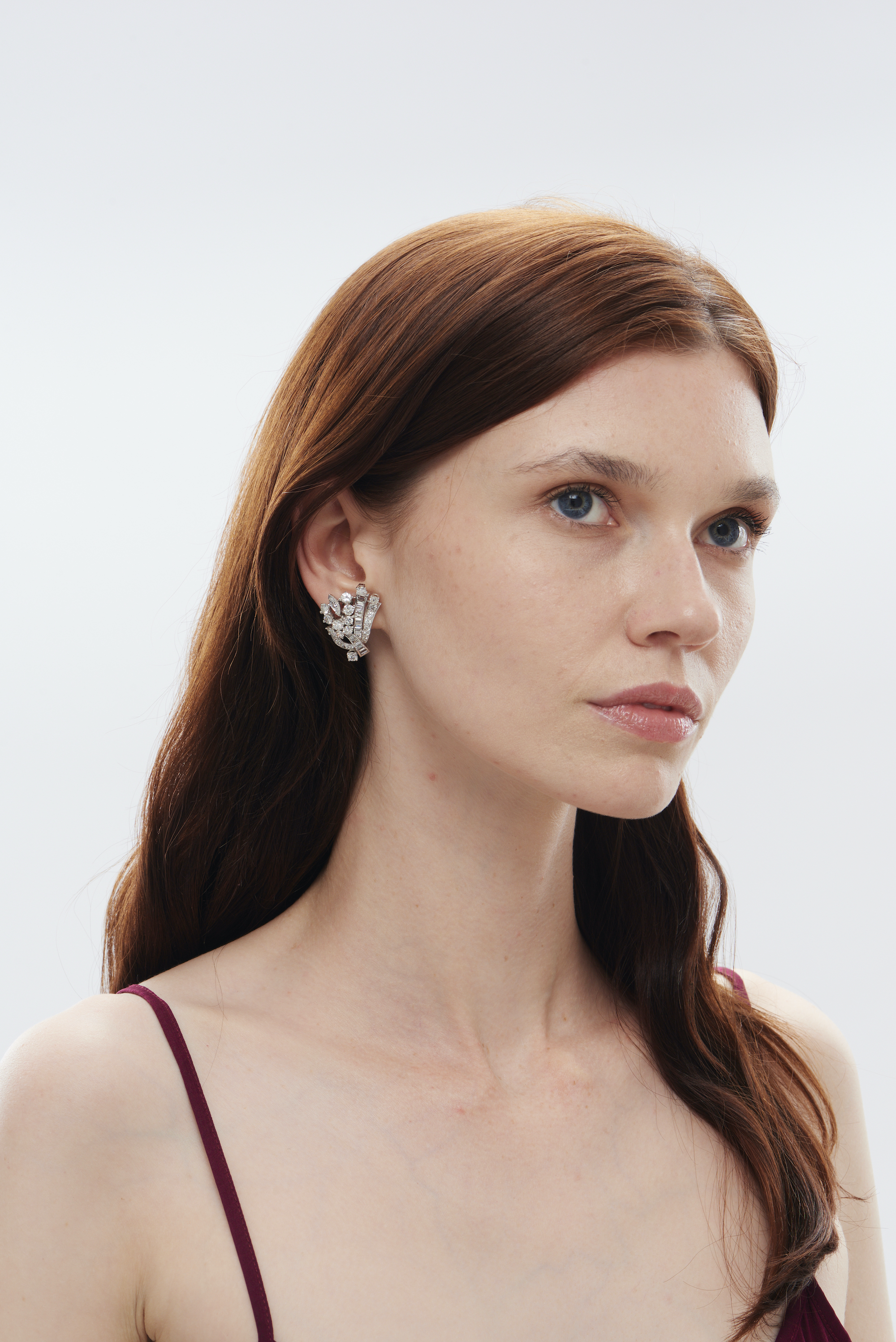 Each modelled as a stylised floral bouquet decorated with marquise-shaped, brilliant-cut and baguette diamonds together weighing approximately 7.00 carats, approximately 27mm x 23mm, clip fittings.