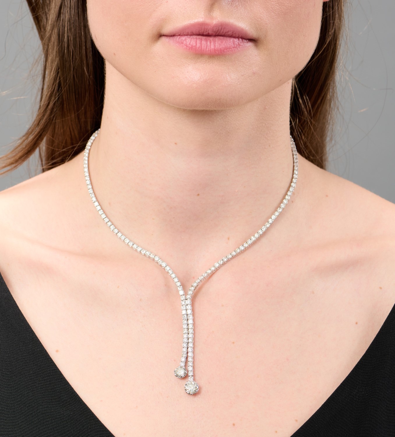 The necklace presents in excellent overall condition. Diamonds present with some variation to colours and clarities throughout the necklace. Feature diamonds are transition cut diamonds of an estimated C1 - C2, clarity SI1 - SI2 and SI2 - P1.