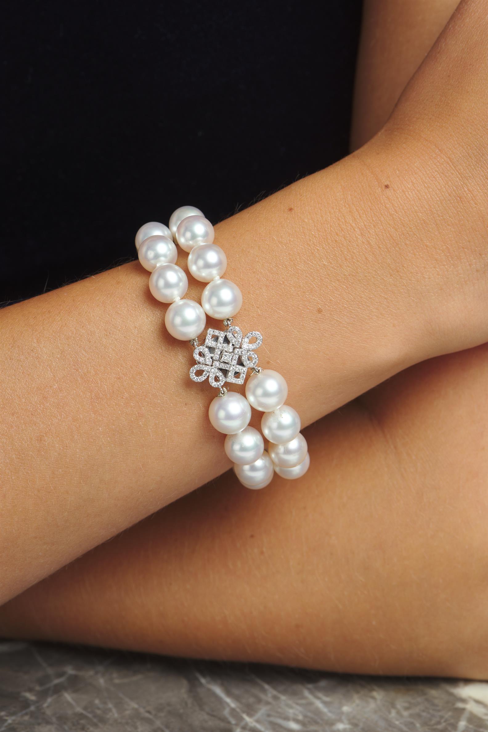 The double row bracelet comprising thirty four near round pearls of silver white hues measuring 10.92mm to 9.30mm, to a decorative clasp set with round brilliant and princess cut diamonds totalling 1.207cts, in 18ct white gold, total length 190mm.