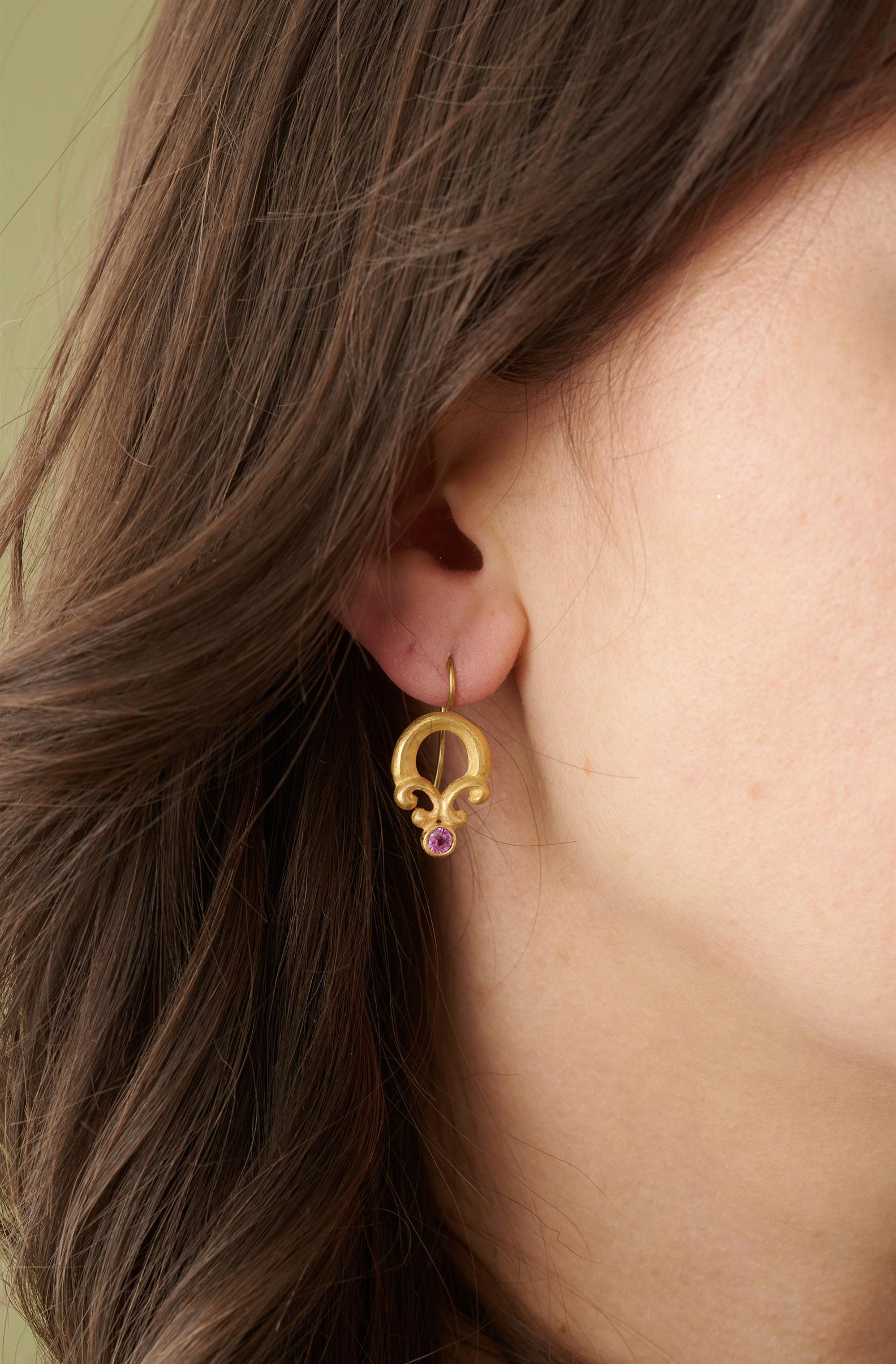 A PAIR OF GOLD AND SAPPHIRE EARRINGS BY SANDY KILPATRICK The open scrolled design detailed with a single pink sapphire, in a matte finish, signed, in 18ct gold, retailed by Makers Mark, circa 2000, boxed, 6.7gms.