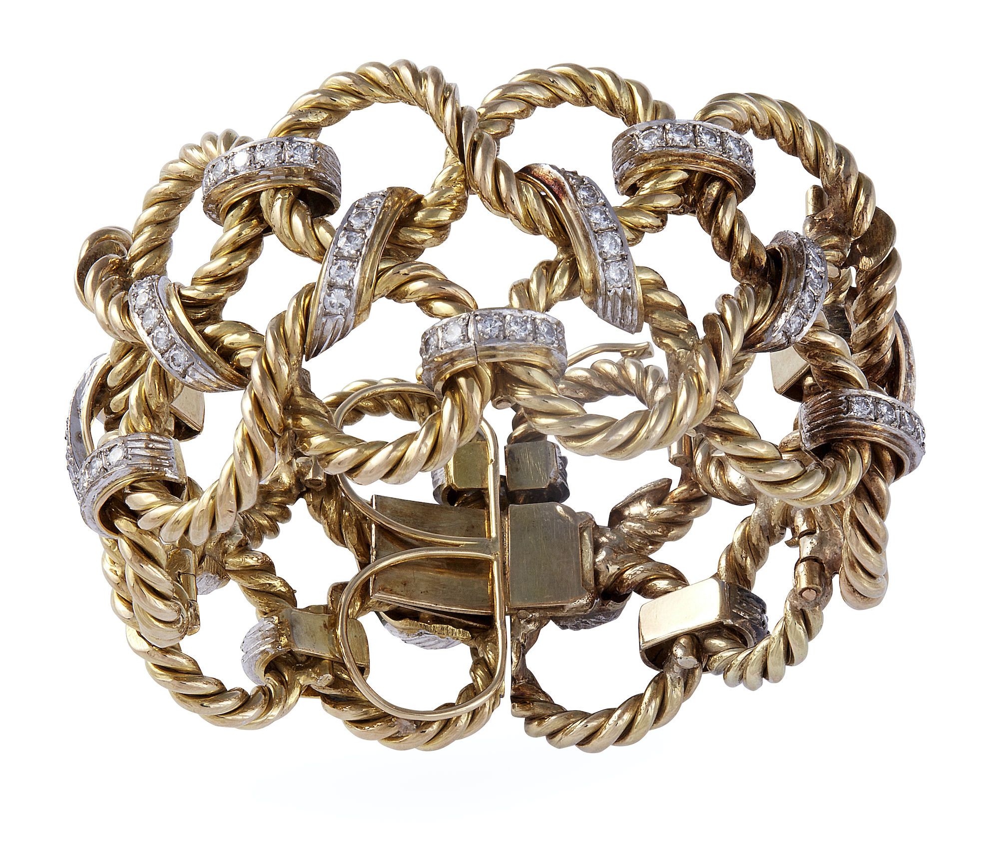Modelled as a 40mm wide openwork twisted wire bangle decorated at intervals with bi-colour connectors pavé-set with brilliant-cut diamonds, the diamonds together weighing approximately 3.50 carats, gross weight approximately 183.90 grams, inner circumference approximately 204mm.