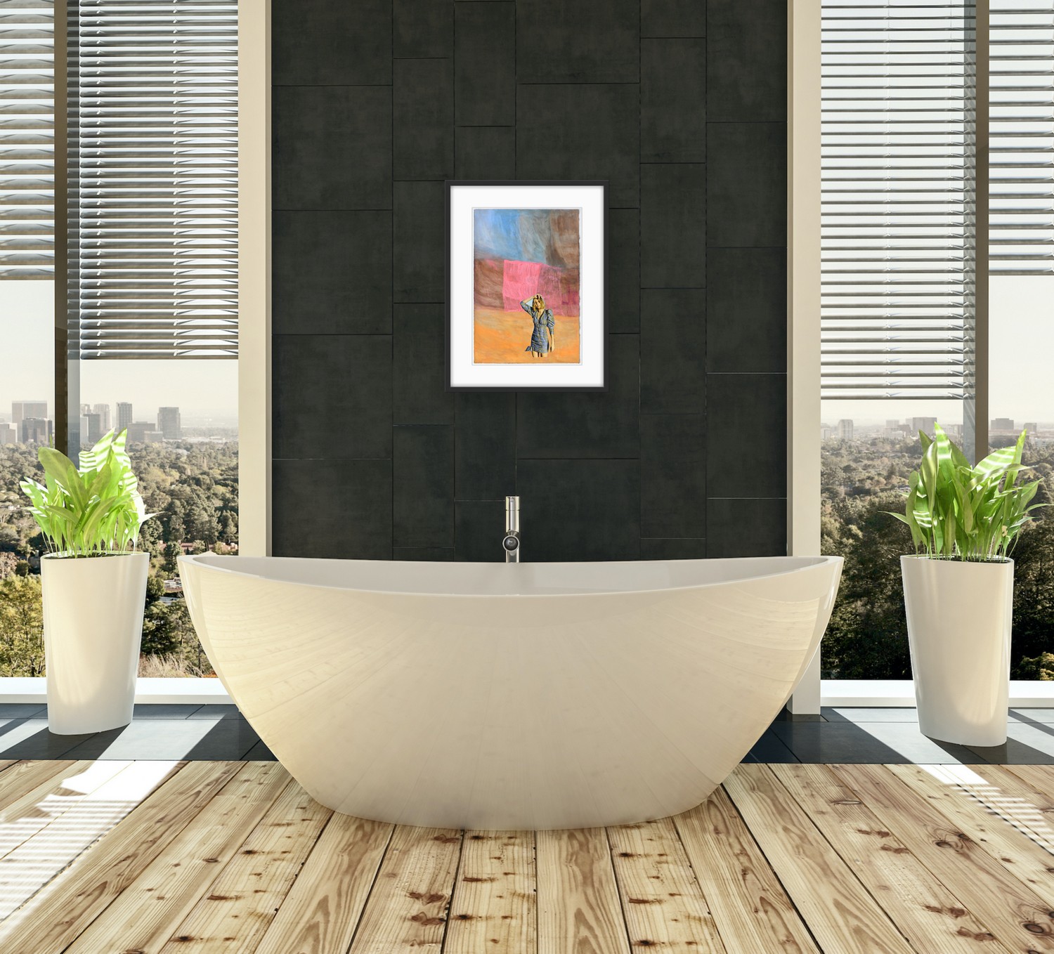 Untitled illustrates Dober's sensitivity to composition and space, the blocks of soft pastel tower beyond the figure, who appears to be standing thigh-deep in orange dust.