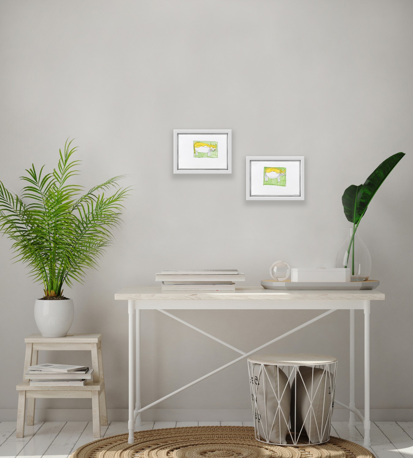 Antonella Masino reveals her affection for cats in her 2D art practice. Her signature process is to draw a cat and then replicate the drawing, resulting in two of the same works. Her style is humble, and presents clear line drawings, coloured sparingly with pencil. Her artworks clearly express a love of cats and the border she places around her pictures add a sentimental element framing her subject within the page.