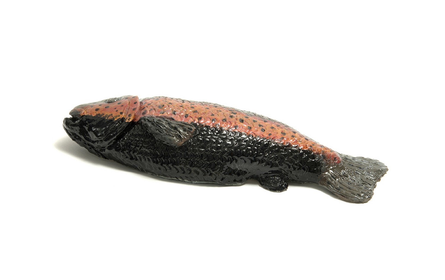 In Mason's ceramic practice reptiles and fish appear often. Rainbow Trout with a Black Underbelly is a great example, the textured scales bouncing light off the peach-gold streak through its belly.