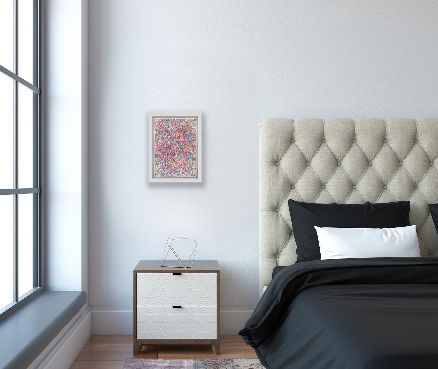 Kristie Newcombe is an emerging artist who joined Arts Project Australia in 2020. Her first works are 'abstract test pieces' and present brightly coloured compositions of beautifully executed linework in felt-tipped marker on paper. There is the illusion of movement on the page, which she creates by applying many colourful groups of lines to that paper that shift orientation. In doing so, she generates directional patterns that lead the viewer's eye fluidly through the composition, almost like catching a still image of a school of fish mid-motion.