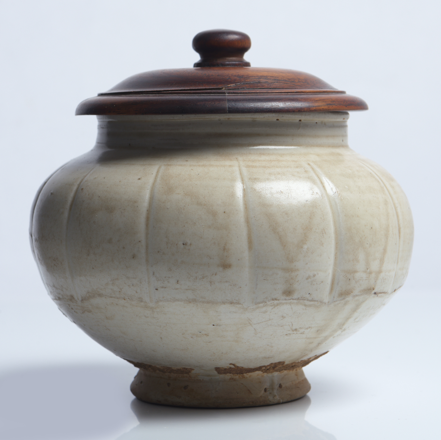 Of melon form with vertical ribs, covered in a creamy glaze. Soil remnants adhereing within and around the foot. Together with a later fitted hardwood lid, and an old collection card.