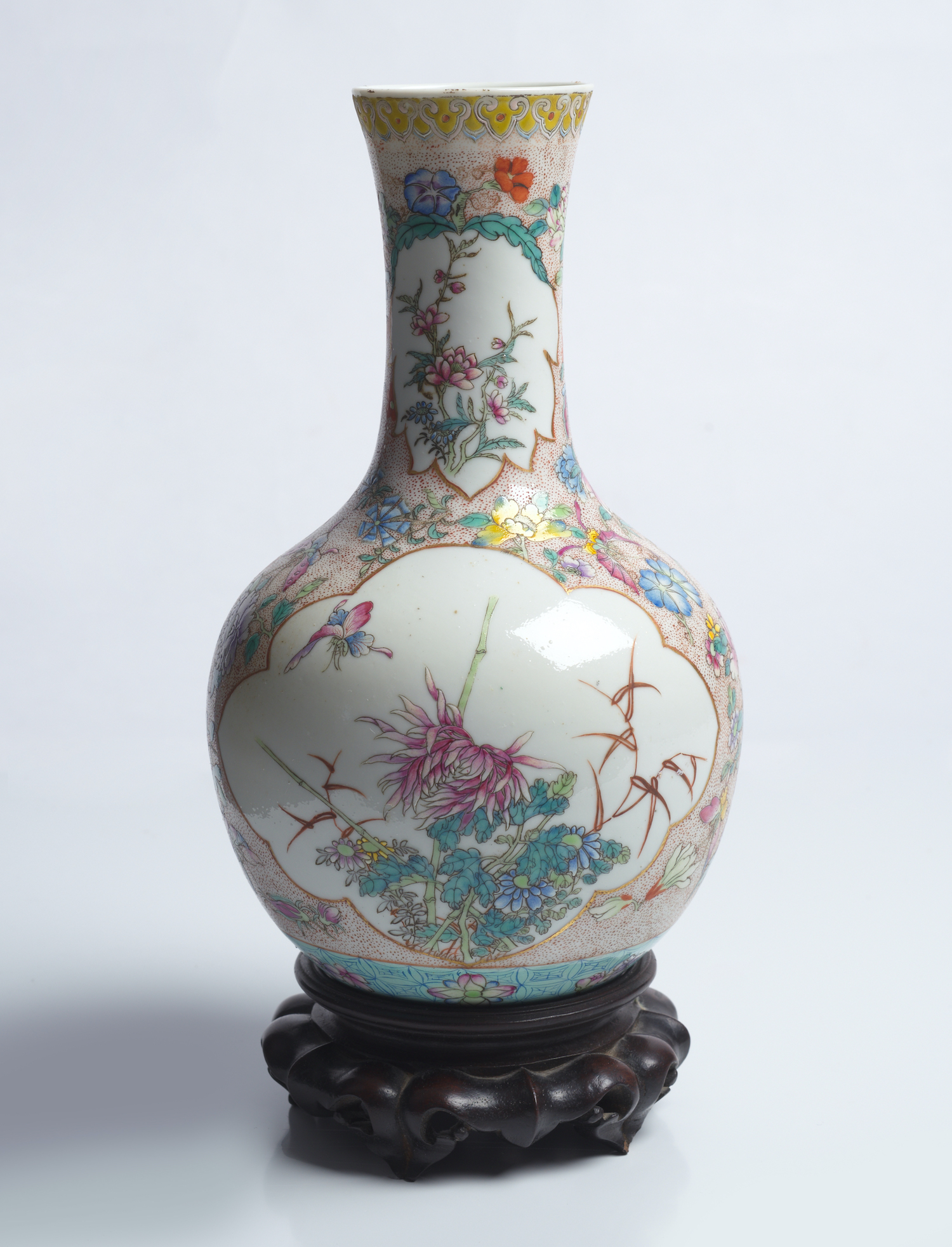 Decorated in famille rose enamels and gilding with shaped reserves containing flowers and butterflies, against a speckled ground with flower sprays and butterflies. Together with a hardwood stand.