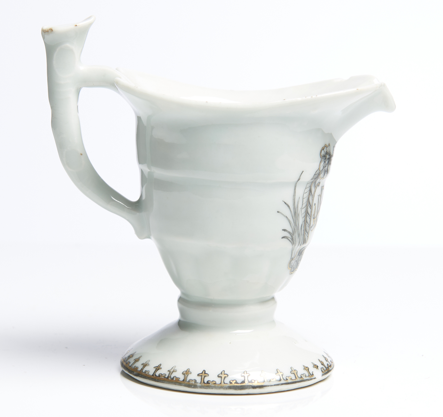 A CHINESE EXPORT ARMORIAL PORCELAIN HELMET-FORM CREAMER