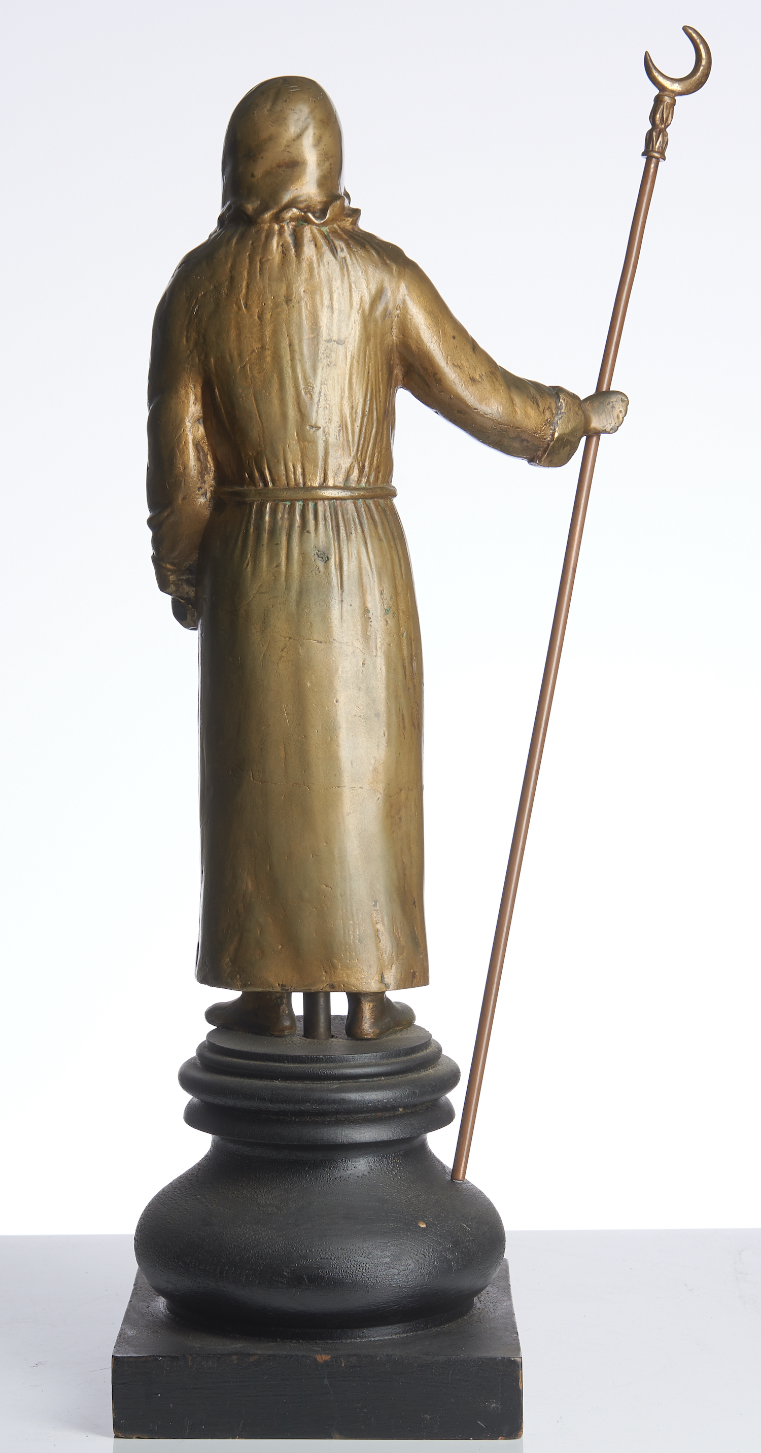 Depicting a standing male with a flowing beard in a hooded robe, his right arm outstretched, raised on an ebonised oak base