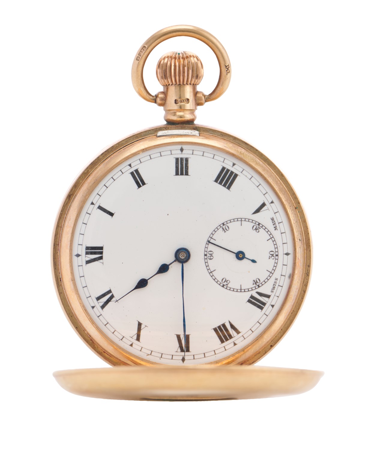 A GOLD HALF HUNTER POCKET WATCH - Crown wind and set movement, circular white enamel dial with black Roman numerals, subsidiary seconds dial at six, 9ct gold case with enamel numerals to the lid, hallmarked Birmingham, case signed A.L.D., Aaron Lufkin Dennison, diameter 47mm.