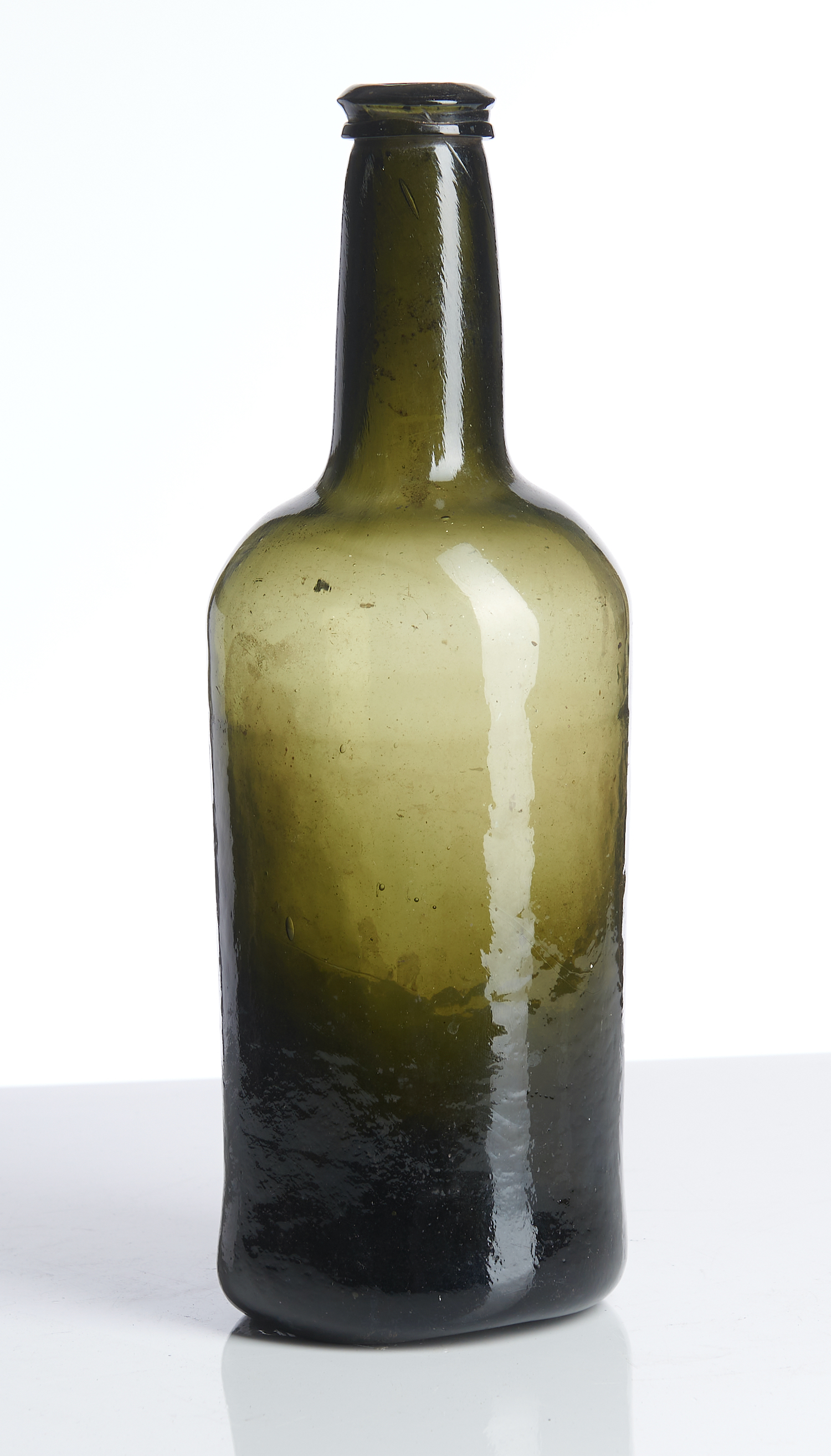 The first with a mallet form body in olive green glass, the other a Dutch gin bottle, of tapering square section, with applied seal