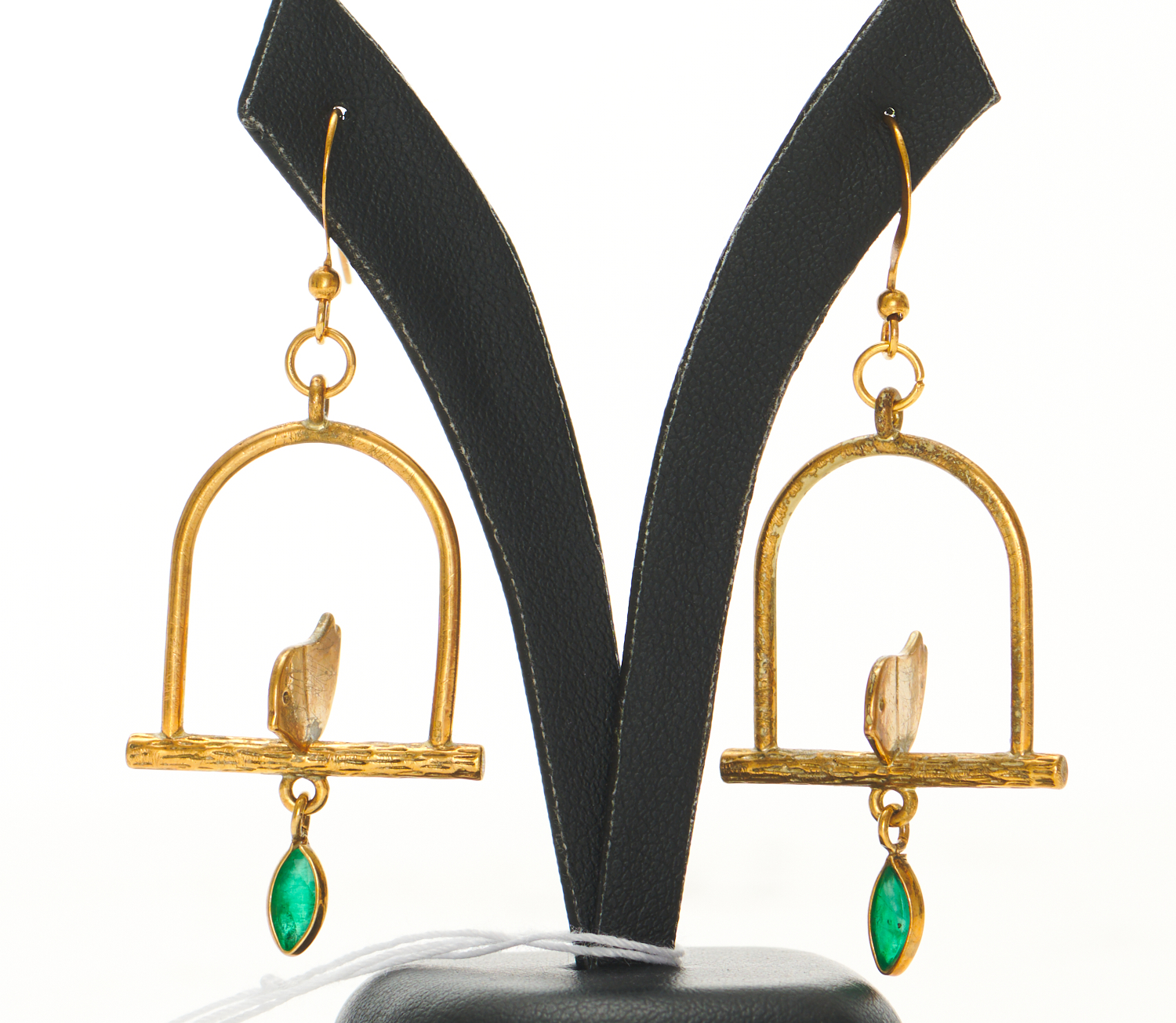 A PAIR OF EMERALD EARRINGS FEATURING A PERCHED BIRD IN GILT, TOGETHER WITH A MATCHING NECKLACE COMPRISING A FAUX PEARL, EARRING LENGTH APPROXIMATELY 5CM, TOTAL NECKLACE LENGTH 46CM