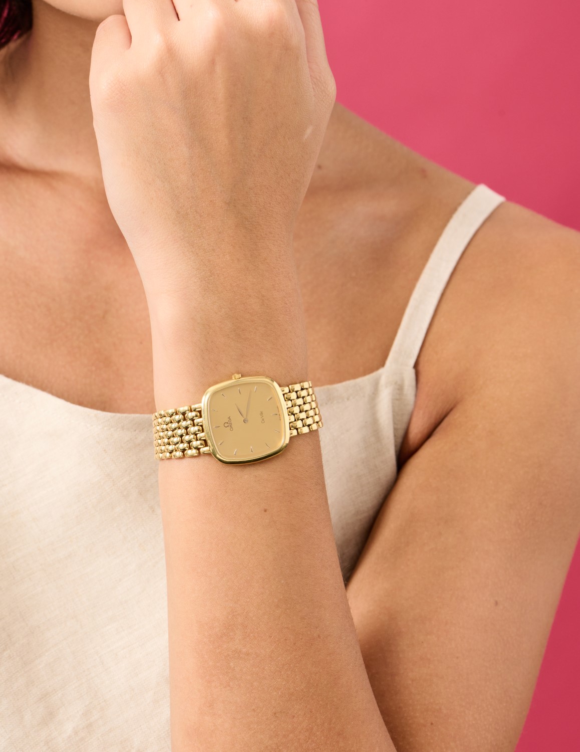 A GOLD OMEGA DE VILLE WRISTWATCH - Quartz movement, cushion shaped golden dial with gold batons, signed case, dial and movement, 18ct gold case and conforming brick link straps and signed clasp, total length 190mm, 30mm square.