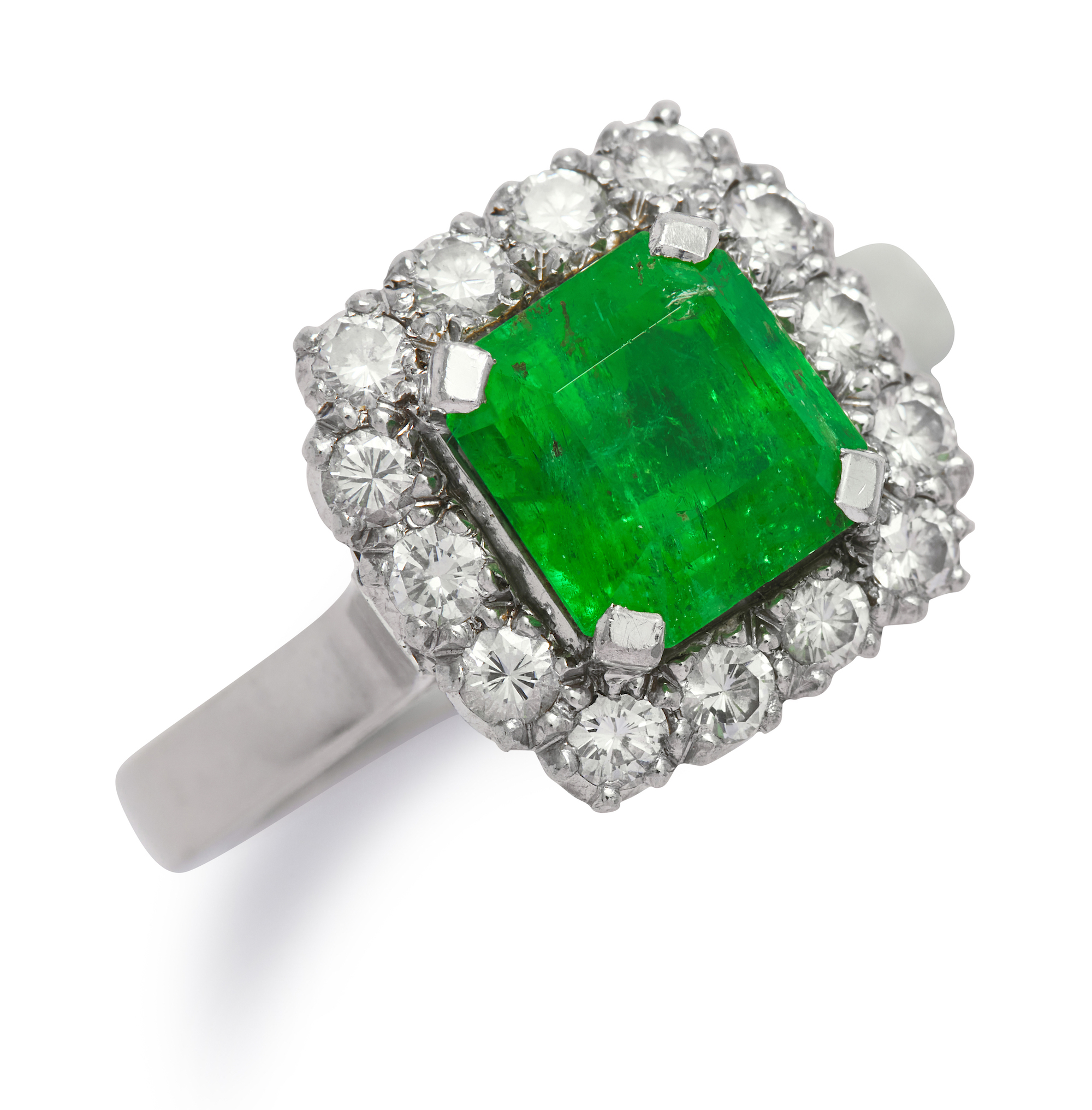 Of cluster design, centring a claw-set octagonal emerald weighing approximately 2.01 carats, framed by a line of brilliant-cut diamonds, the diamonds together weighing approximately 0.56 carat, size M.