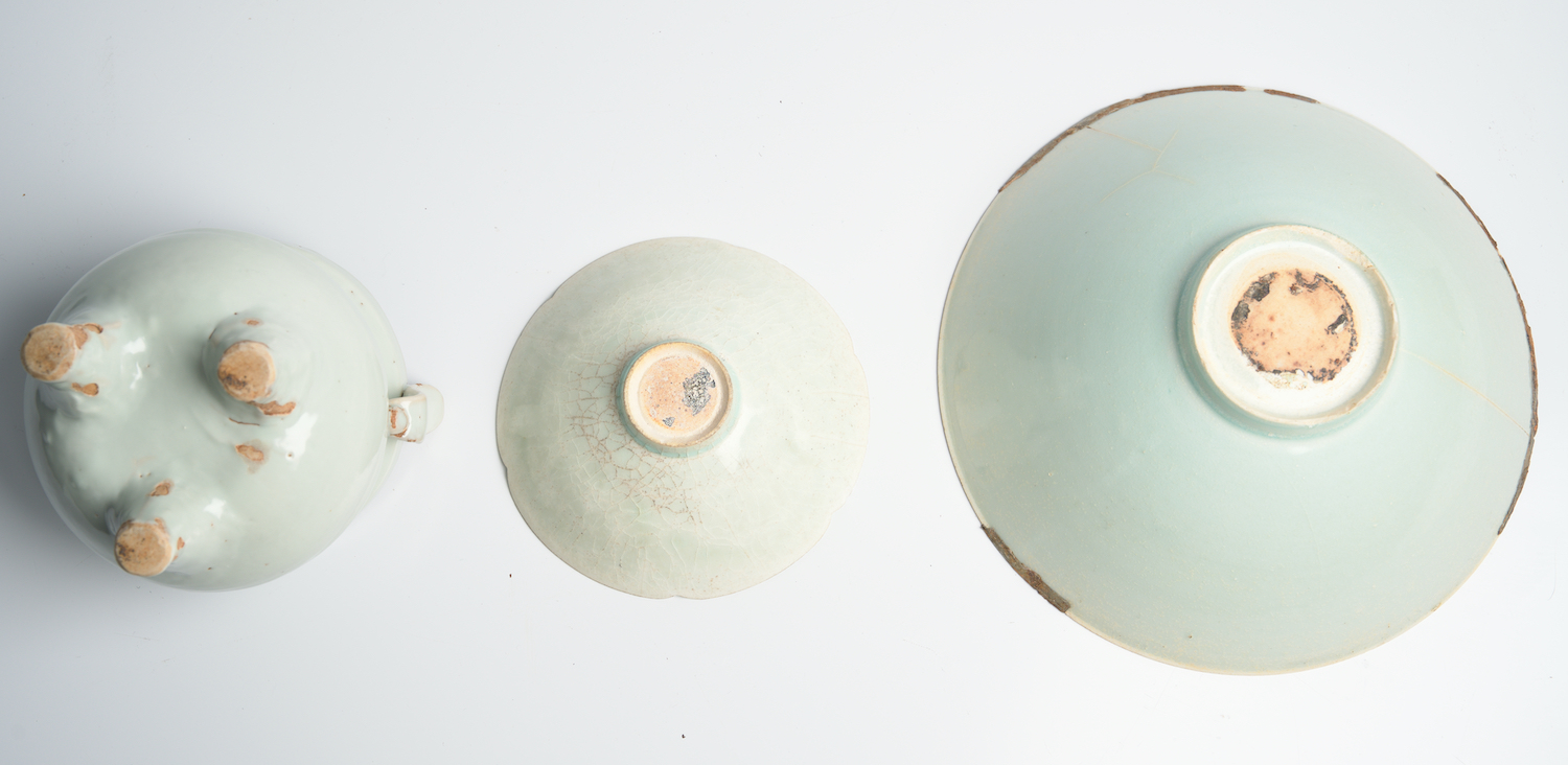 Comprising: a large Qingbai bowl with carved design of clouds and remnants of the original silver rim; a small foliate rim Qingbai bowl with moulded decoration; and a shufu-type glazed tripod censer (possibly Yuan).