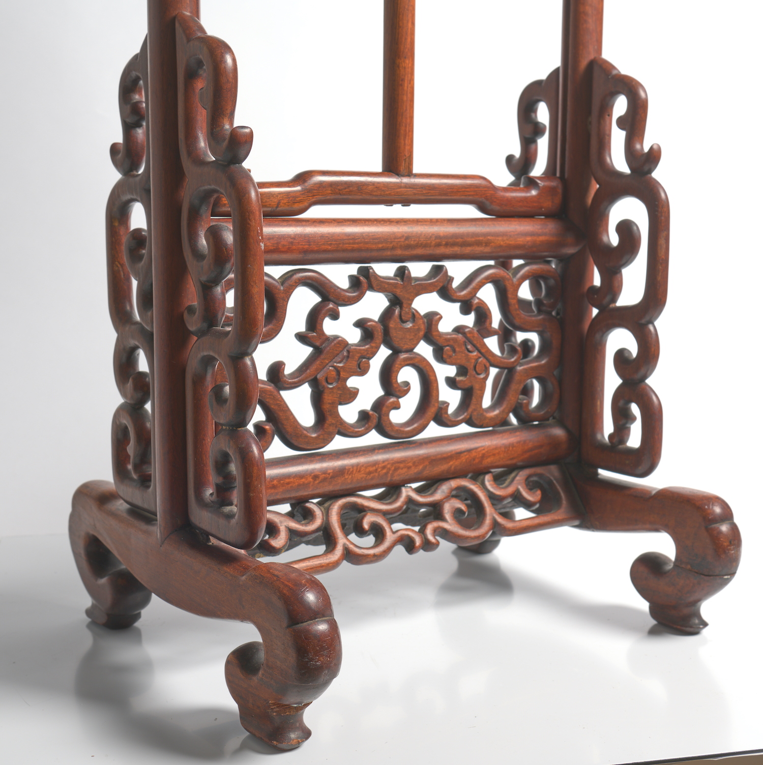 The fine hardwood stand decorated with a pierced panel and spandrels, the lamp pole with a simple mechanism to allow the height to be adjusted.