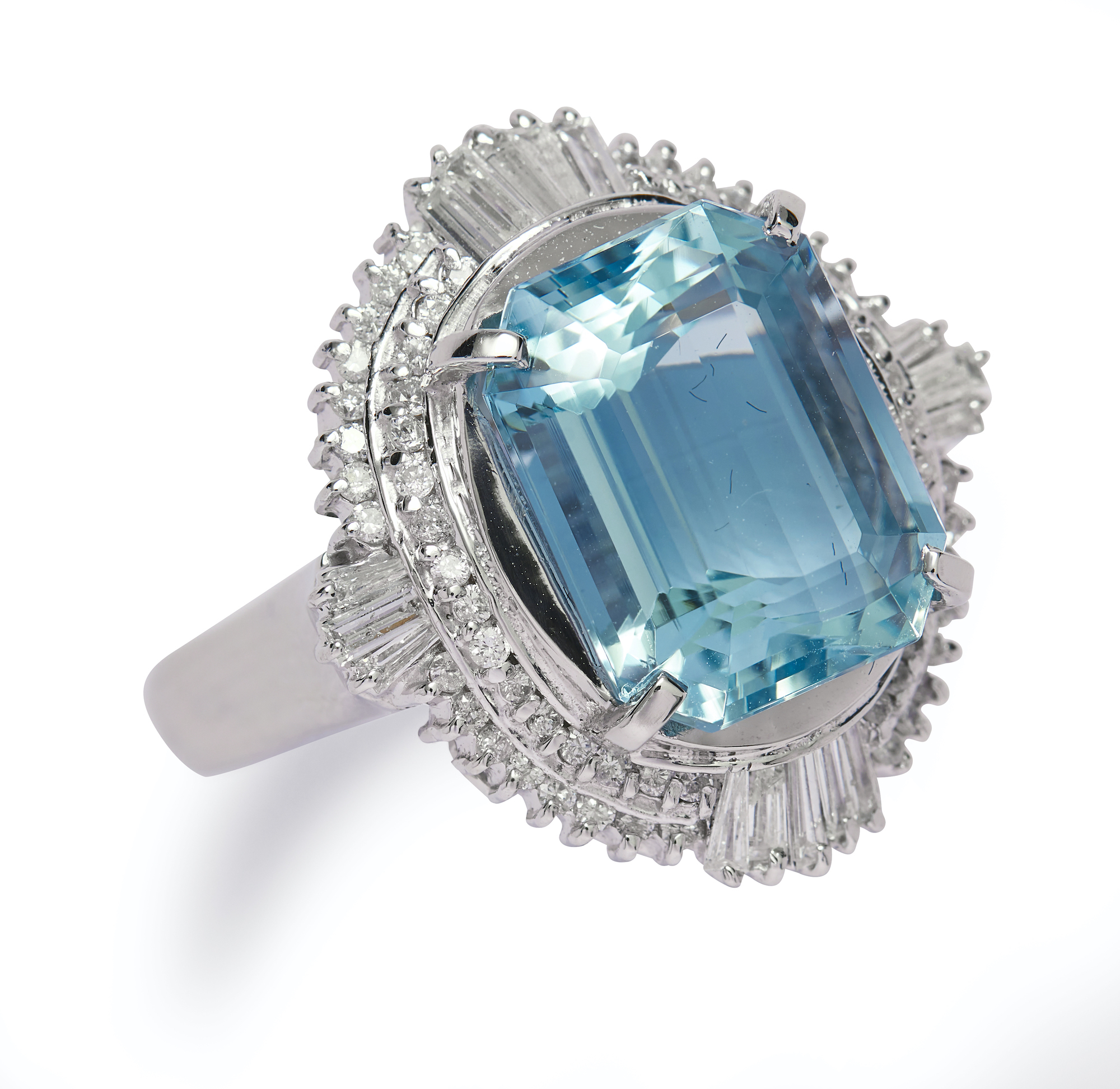 Of cluster design, centring a claw-set emerald-cut aquamarine weighing approximately 9.67 carats, framed by an undulating surround of brilliant-cut and baguette diamonds, the diamonds together weighing approximately 1.03 carats, size T1/2.